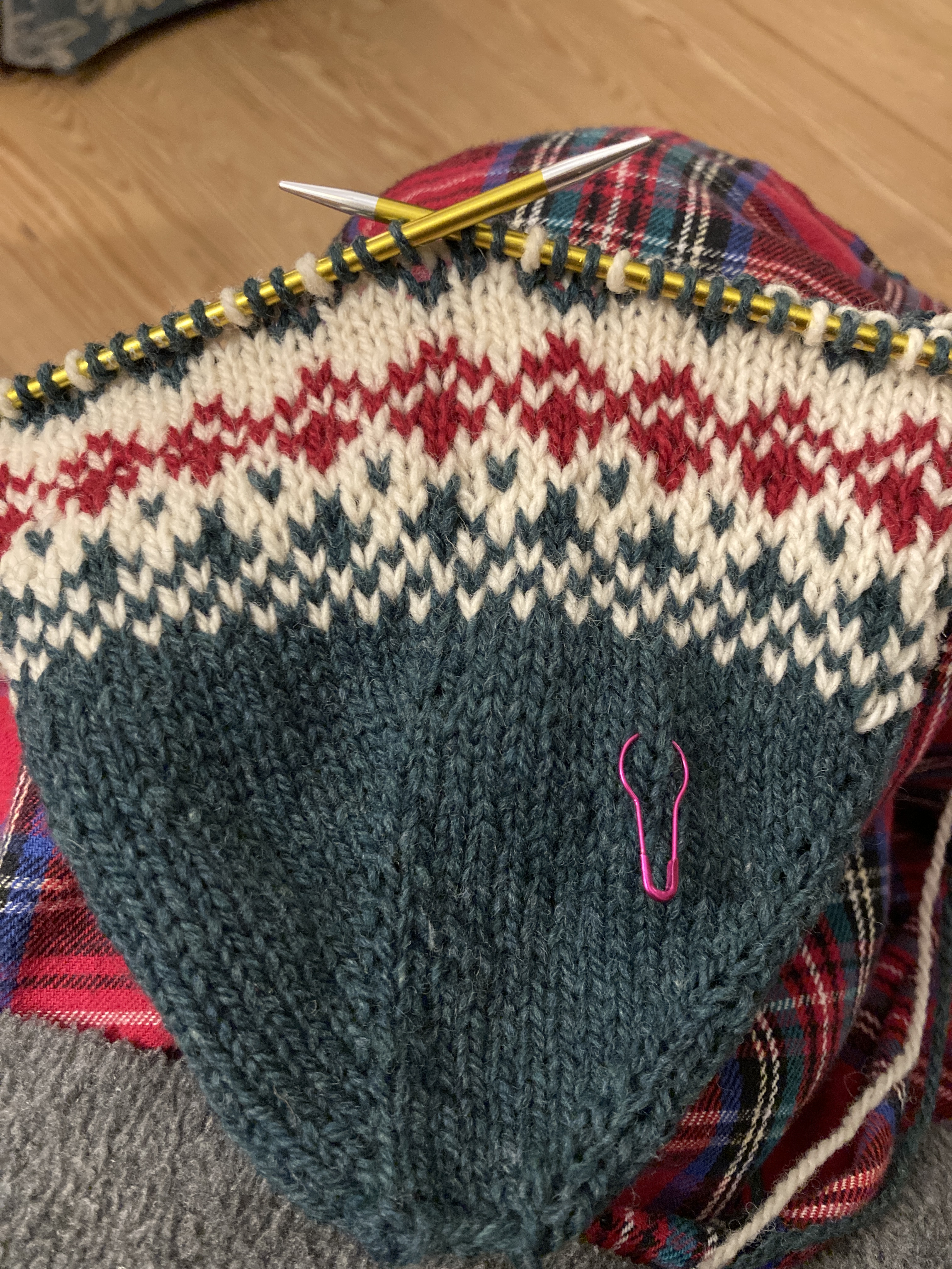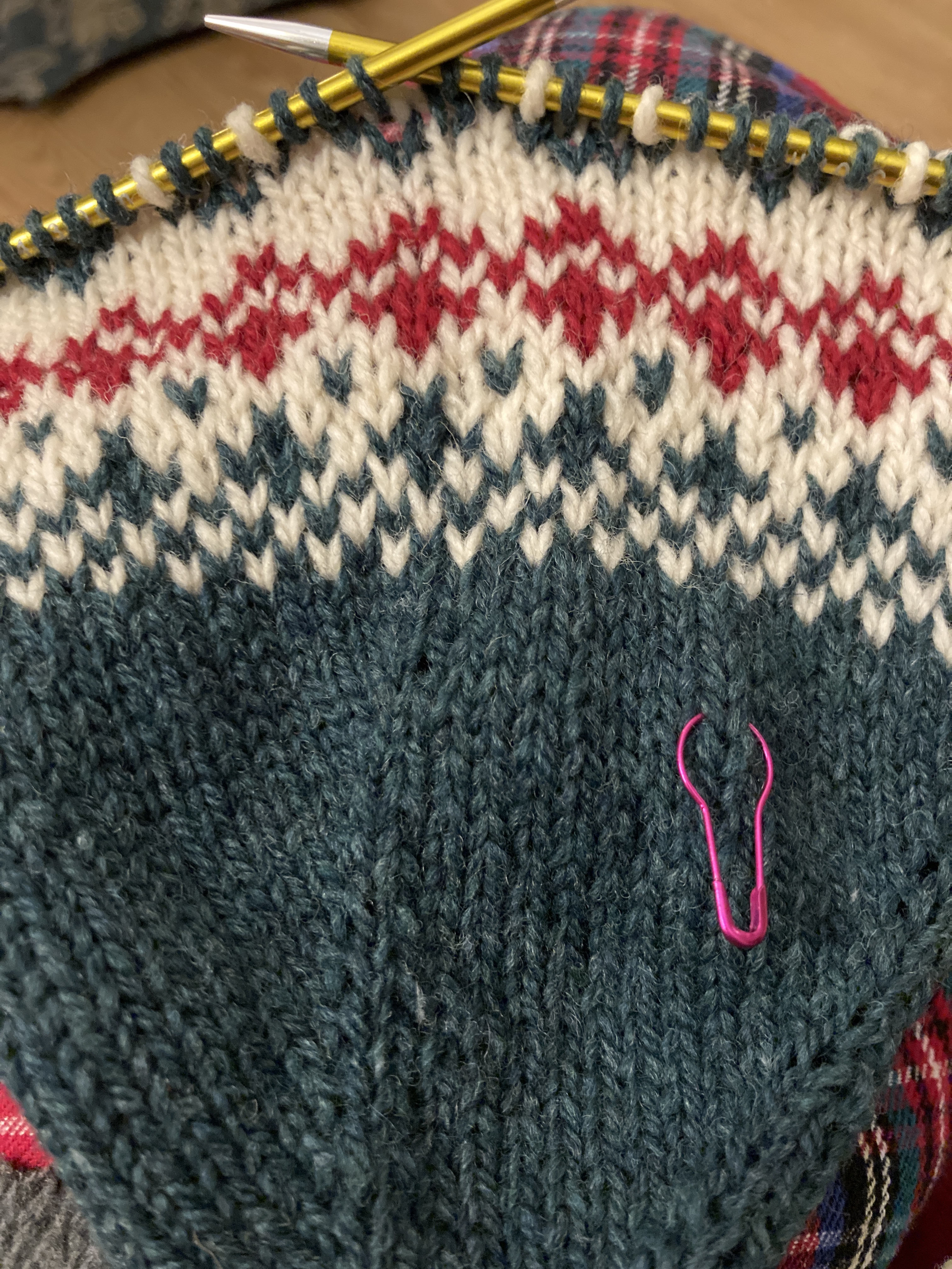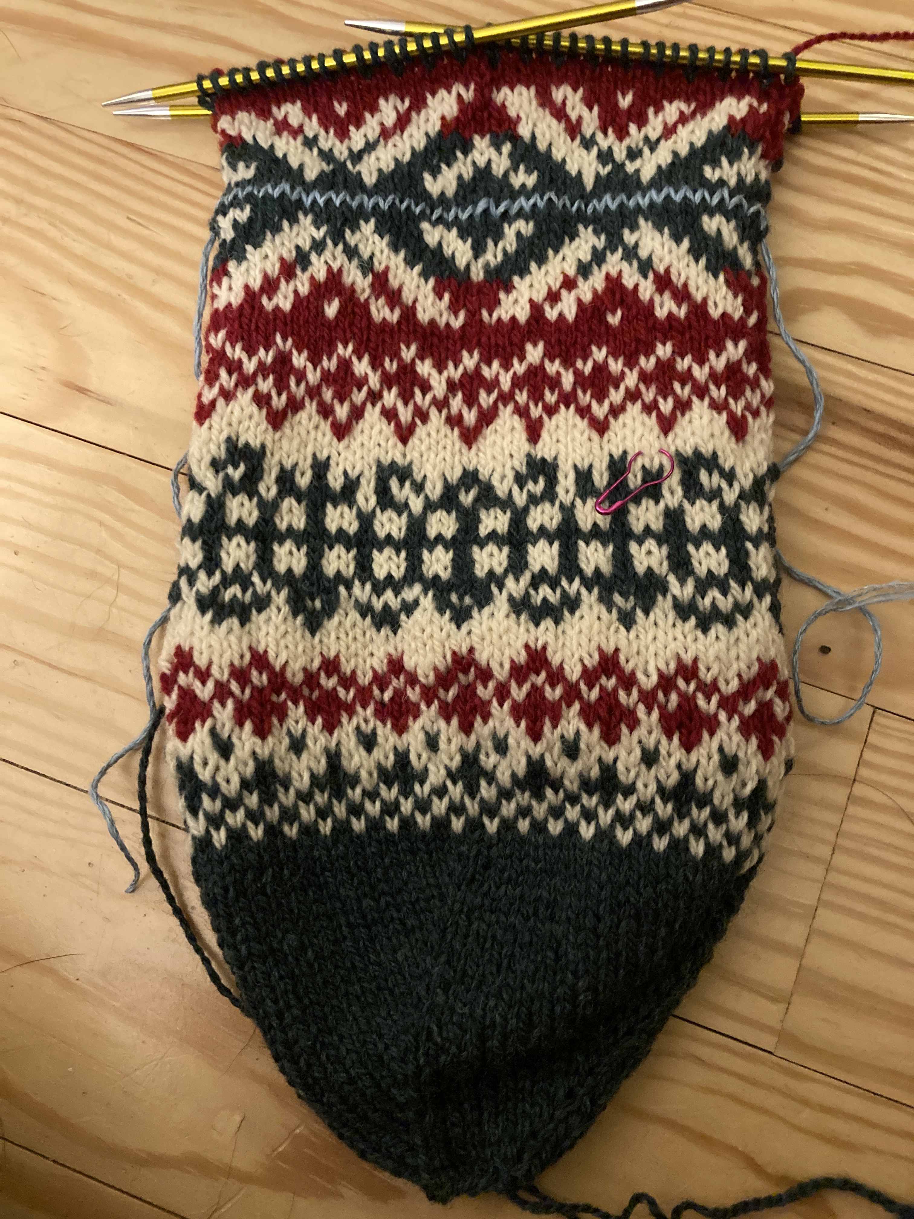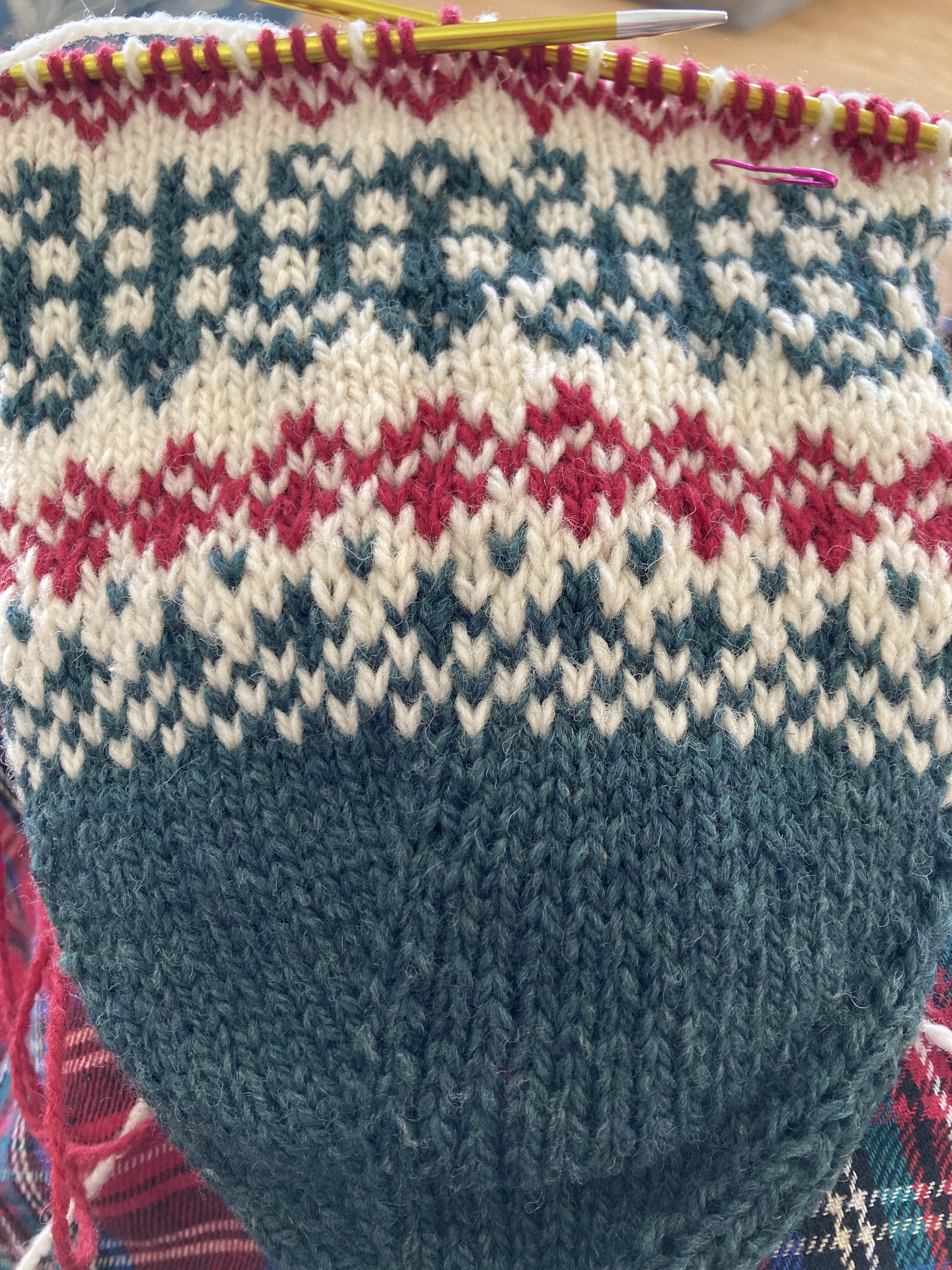 Earlier this week I got the MKAL bug and decided that I’d do the knit along with Arne & Carlos. They’re knitting another stranded Christmas stocking in three colors and I just couldn’t stand to miss out on this one (again) this year. We don’t NEED any more stockings but I can use them for guests or for simple decorations. I chose the yarn, Patagonia Organic Merino, in the same three colors that I used for my Advent Mini-Jumpers that I finally finished last year. That way, they’ll all match. I cast on Saturday and got through the sixth clue. Yesterday I finished the tenth one and that meant that I was caught up and from now on I can just knit the six rounds a day to knit along. I am really enjoying the pattern and I love the yarn. Once blocked, this will be a great addition to our Christmas decorations. (Maybe I’ll even put some up this year.)