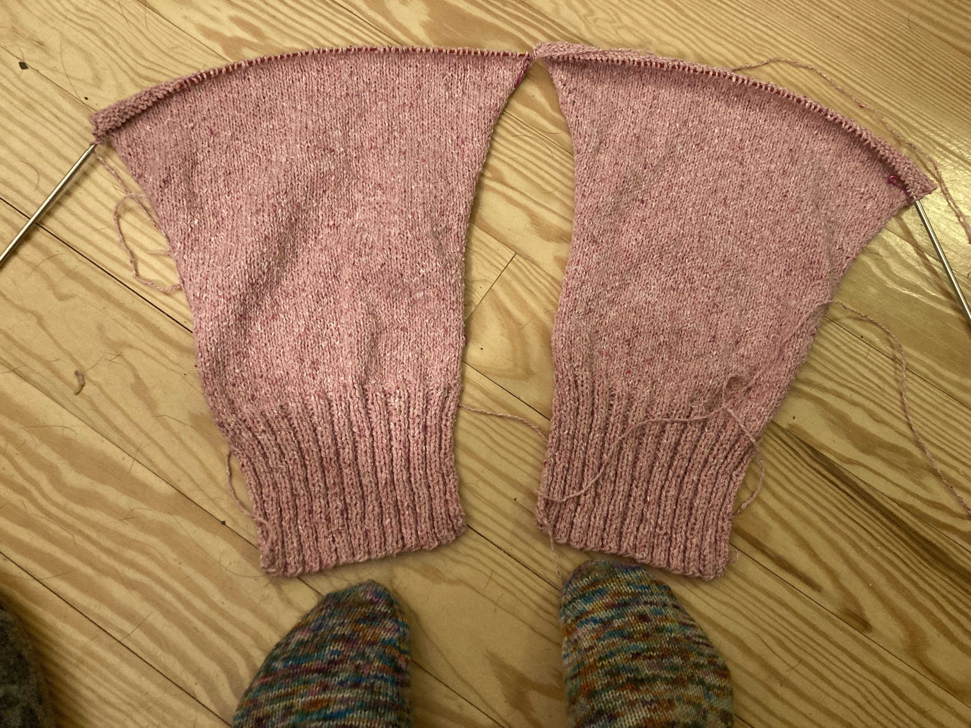 I’ve been knitting every day. On my needles, I have a Stockholm Slipover in stashed yarn. I am really happy with the way it’s knitting up and I am almost down to the ribbing which means there is a bit of stockinette and some ribbing at the bottom, around the sleeves and neck and then I can wear it. I’ve also cast on a Musselburgh hat in a pink HuMade yarn that I got a Knitty City when I was in the city a while ago. I’m holding it with a strand of Berroco Aerial mohair/silk. I think I’m near the end of the increases and ready to hit the round and round of stockinette stitch.
