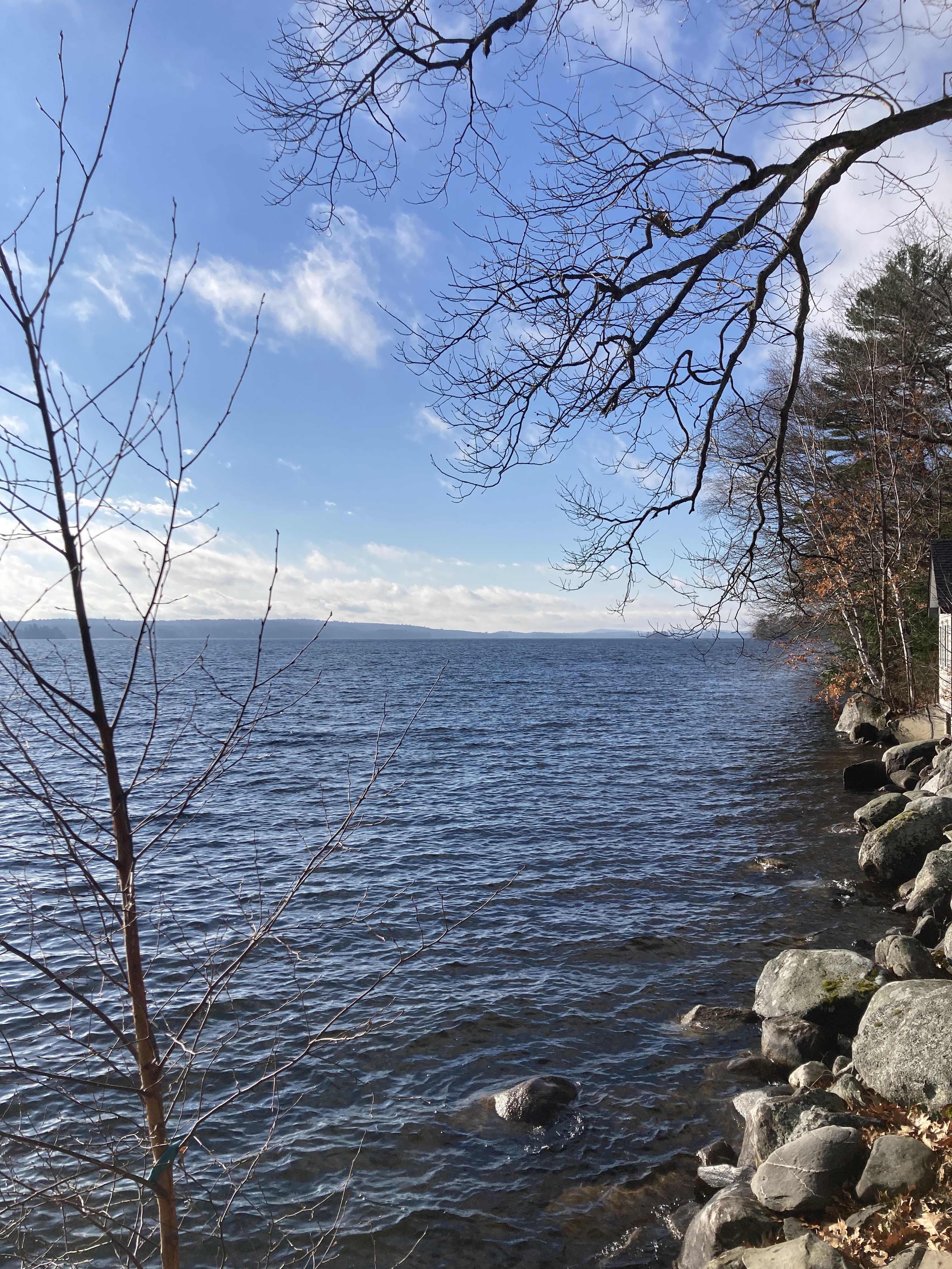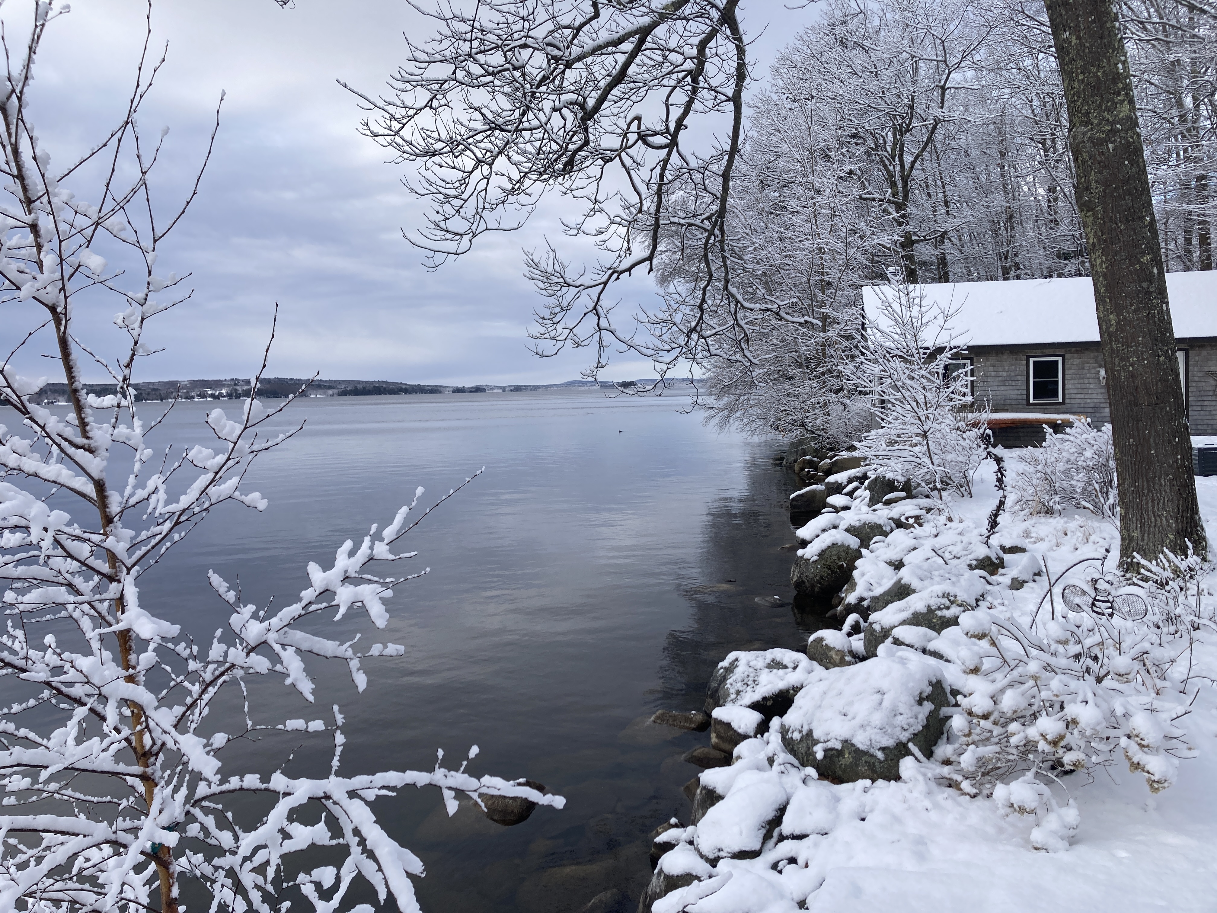 What a beautiful thing to wake up to snow-covered trees this morning. Yesterday was a mixed bag of precipitation but starting at about 5pm, it snowed. I’d say we have about three inches of wet, heavy snow on the ground. AND we have no more ice on the lake! During the night we may have gotten some wind which would have demolished what thin ice was left as it got dark last night. This morning there is no more ice. Warm weather can’t be far off now!