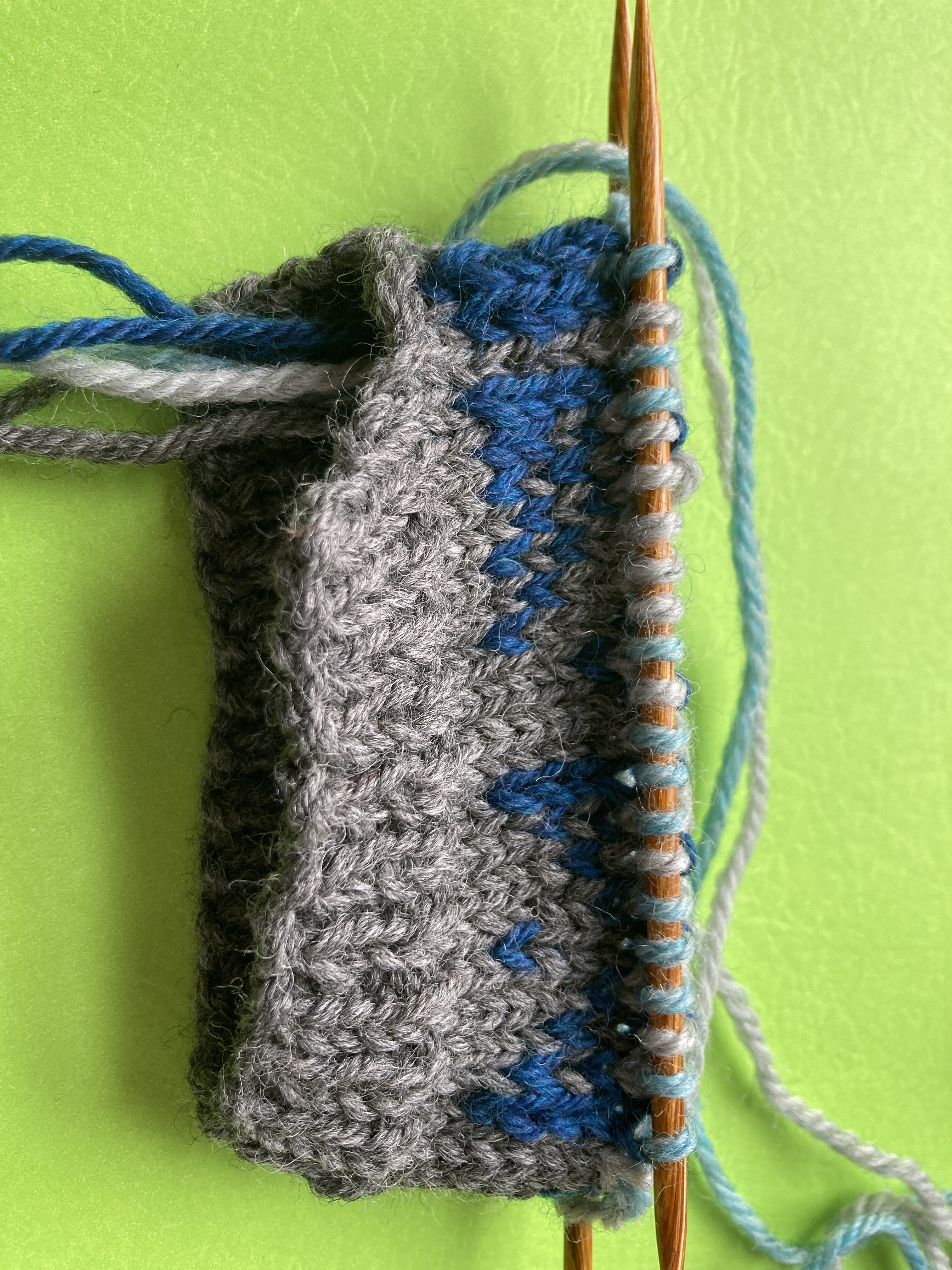 In a week I will be teaching the first of two parts of a workshop on colorwork knitting. I’ve got to get a couple of examples together and knit a few swatches so I can demonstrate at different times in the workshop. I have a big group signed up and I’m excited about the interest. Our knitting project will be a coffee cup cozy knitted in the round and then we’ll cut a steek to finish it off. But it’s a great, worsted weight “swatch” to learn the techniques and to get knitters ready to knit a colorwork project with more confidence.