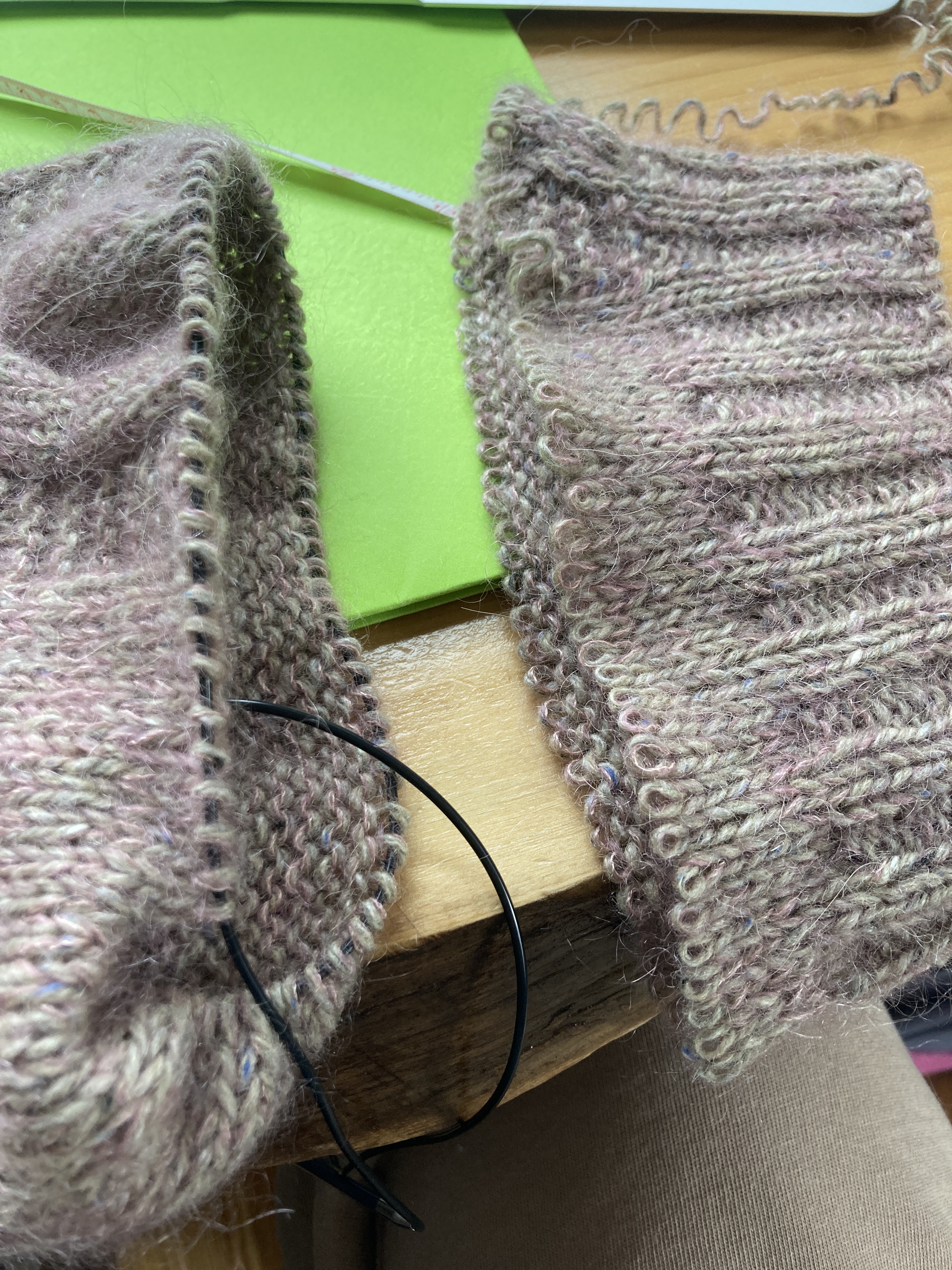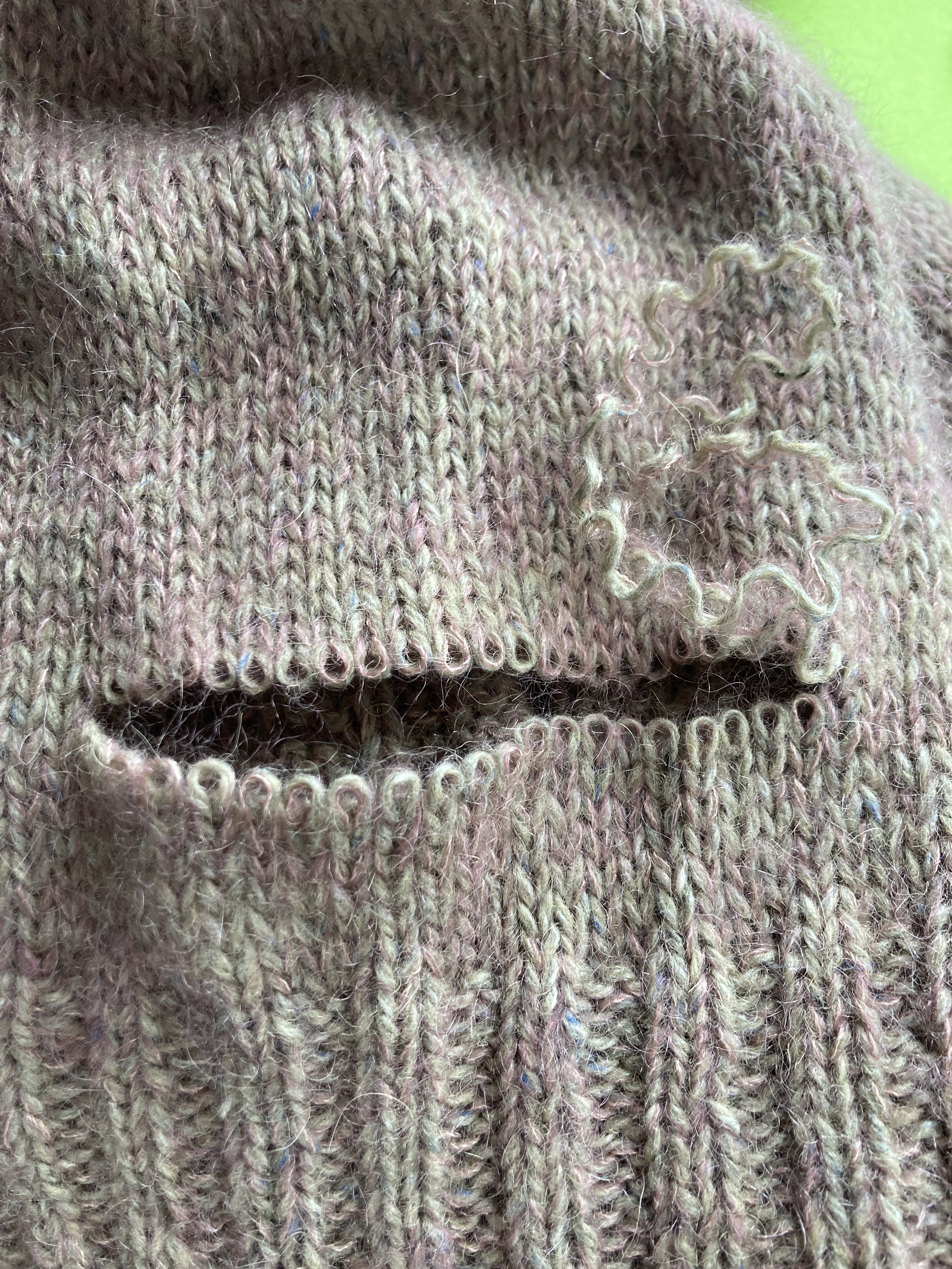 The sleeves were way too long. I would have had to fold the cuff fully over and that’s not what I envisioned for this sweater. So I pondered solutions. First I tried to unravel the yarn. If you have ever worked with mohair, you know it’s fuzzy and sticky and difficult to frog back. I struggled with finding the woven-in end and pulling that back … it wasn’t going to work for four inches of knitted and blocked fabric. So, the only other solution I could think of was to cut off the cuff and another two inches of fabric and then re-knit the cuff. I certainly wasn’t going to wear it as it is and I had invested so much time and money into the garment, I had to try to fix it.