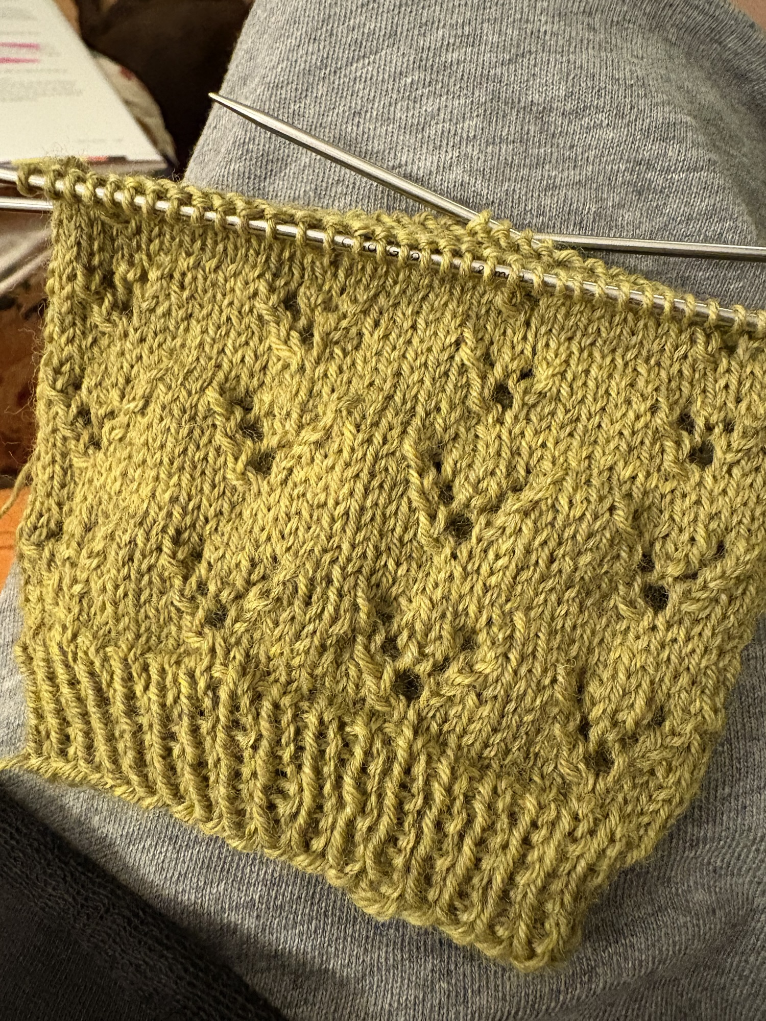 My SISC continues with Murmuration. Another pattern from the Sock Project book by Summer Lee. I may have already posted this photo but I repost it because there is a mistake here and the photo pointed it out. I’ve since frogged it back and added another (third) eyelet round to the third lace pattern. Good grief. My brain! My focus is definitely struggling with all that’s going on in the world. I am looking forward to our Rhode Island vacation next week and am planning to tune out and turn off social media for a few days to see if that helps my brain to focus. It’s all good in the end but good grief, I’m supposed to be an “expert” and a knitting teacher. I get frustrated with myself when I make such rookie mistakes!