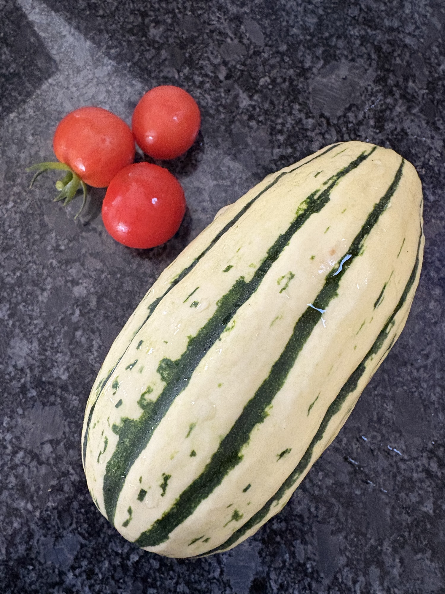 I picked three cherry tomatoes and my first Delicata squash today from the garden. they say that Delicatas are ready to pick when they have stripes and you can’t easily break the skin with pressure from your fingernail. This one is there. I think I’ll have to cook it for supper tonight to see how it tastes. I also have cups (and cups) of shredded zucchini to use and will get it grayed, freeze some of it and bake with some of it. Plan is to make some zucchini bread, some chocolate zucchini bread and maybe a chocolate zucchini cake to take with us to the beach. Yum. We still have e some tomatoes on the vines and a few more delicatas coming along. Lettuces and kale are going to be picked today for salad with my supper.