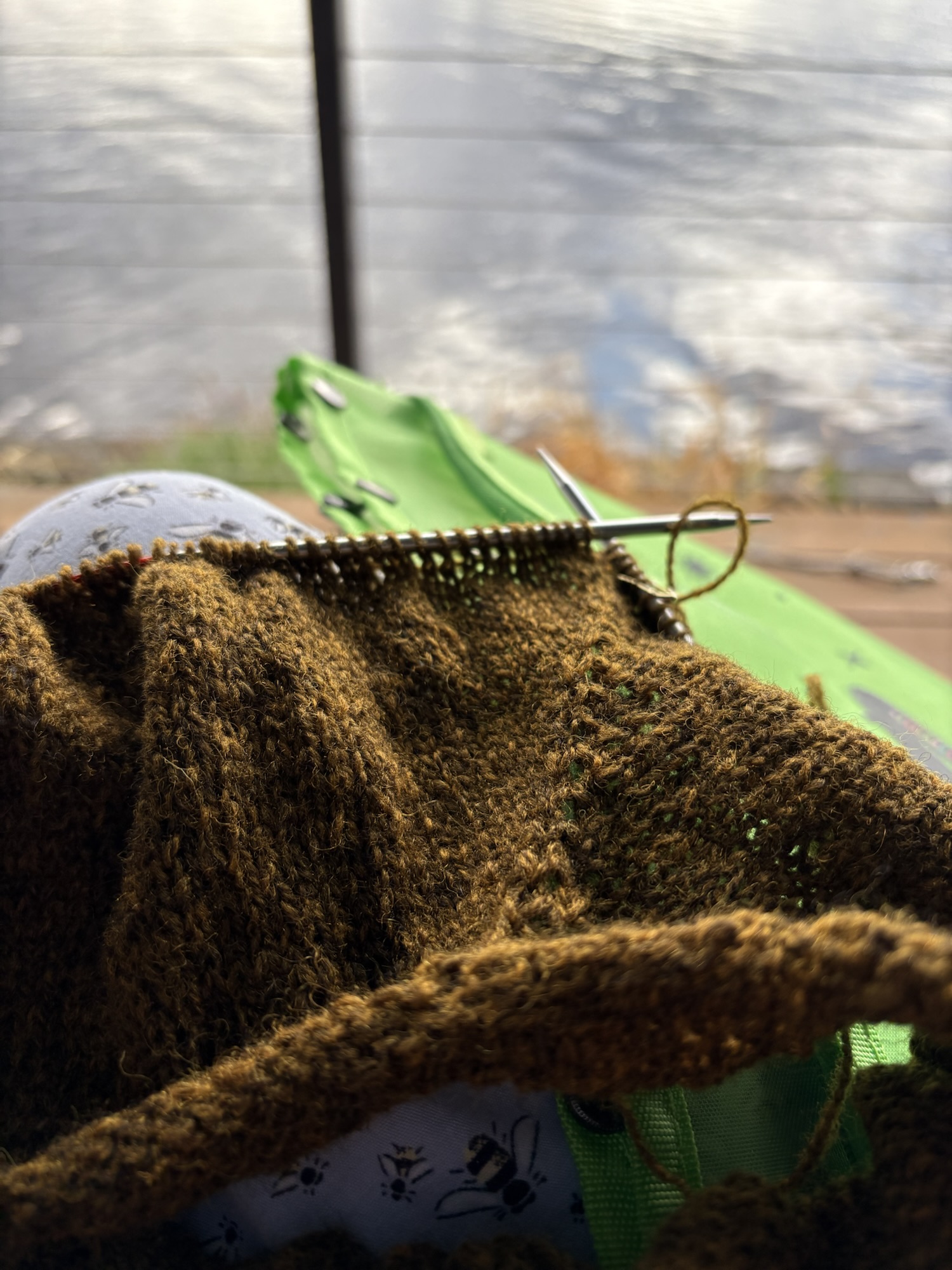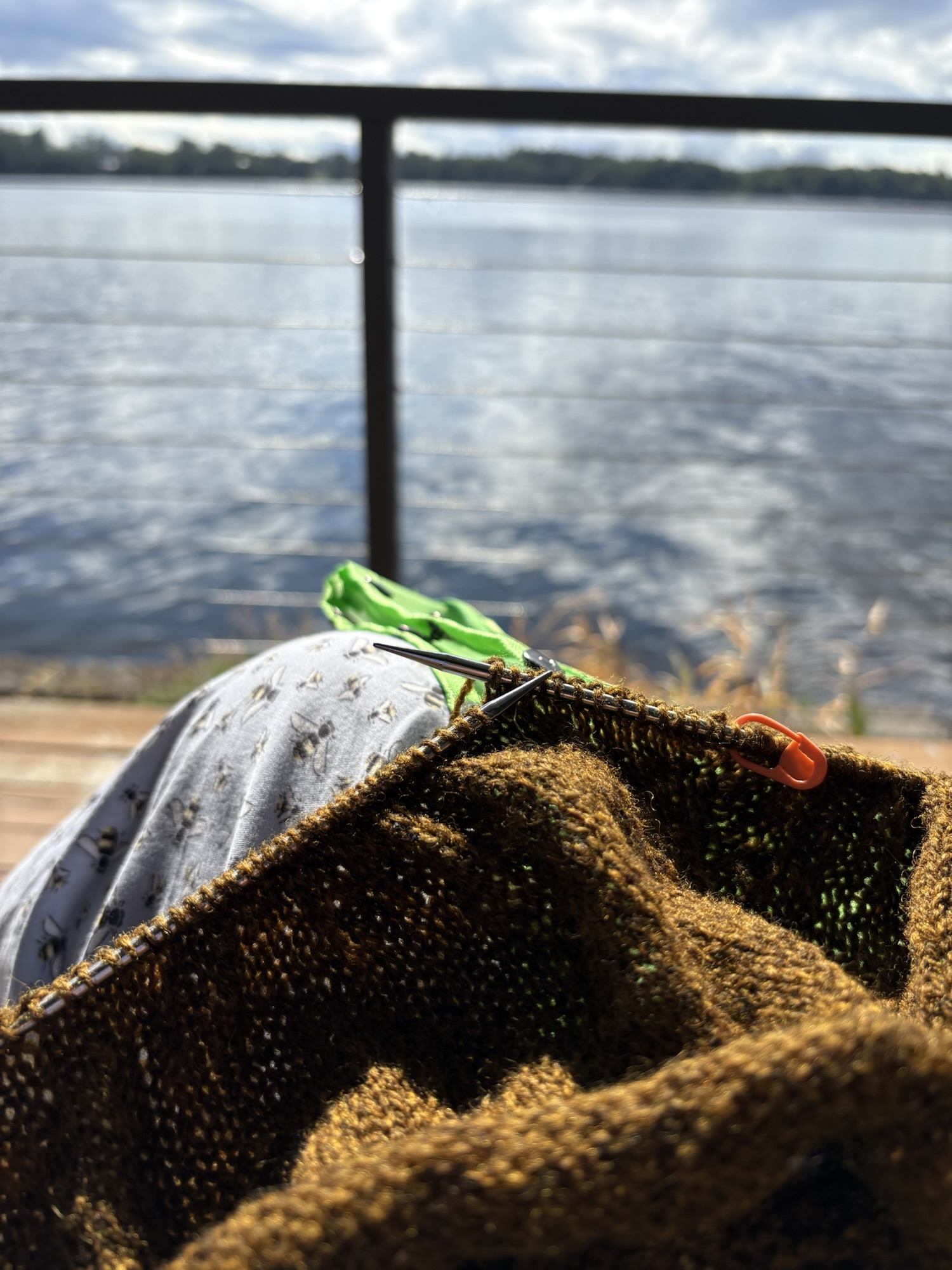 I have had a lovely, peaceful morning with my coffee and yarn on the porch. I got up without an alarm, took the dog out, fed the dog and took my coffee out to the porch. It was pretty gray and we even had a little sprinkle of rain. Since then, I went up to my atelier for my yarn and I’ve been sitting here drinking my coffee and knitting and listening to the sounds of the lake. The sounds of home. Hummingbirds chasing each other away from the feeder, ducks quacking by, the train passing heading south, and the splash of an osprey right in front of our boathouse (coming up with empty talons.) And now the sun is coming out and the bees are buzzing in the cat mint.