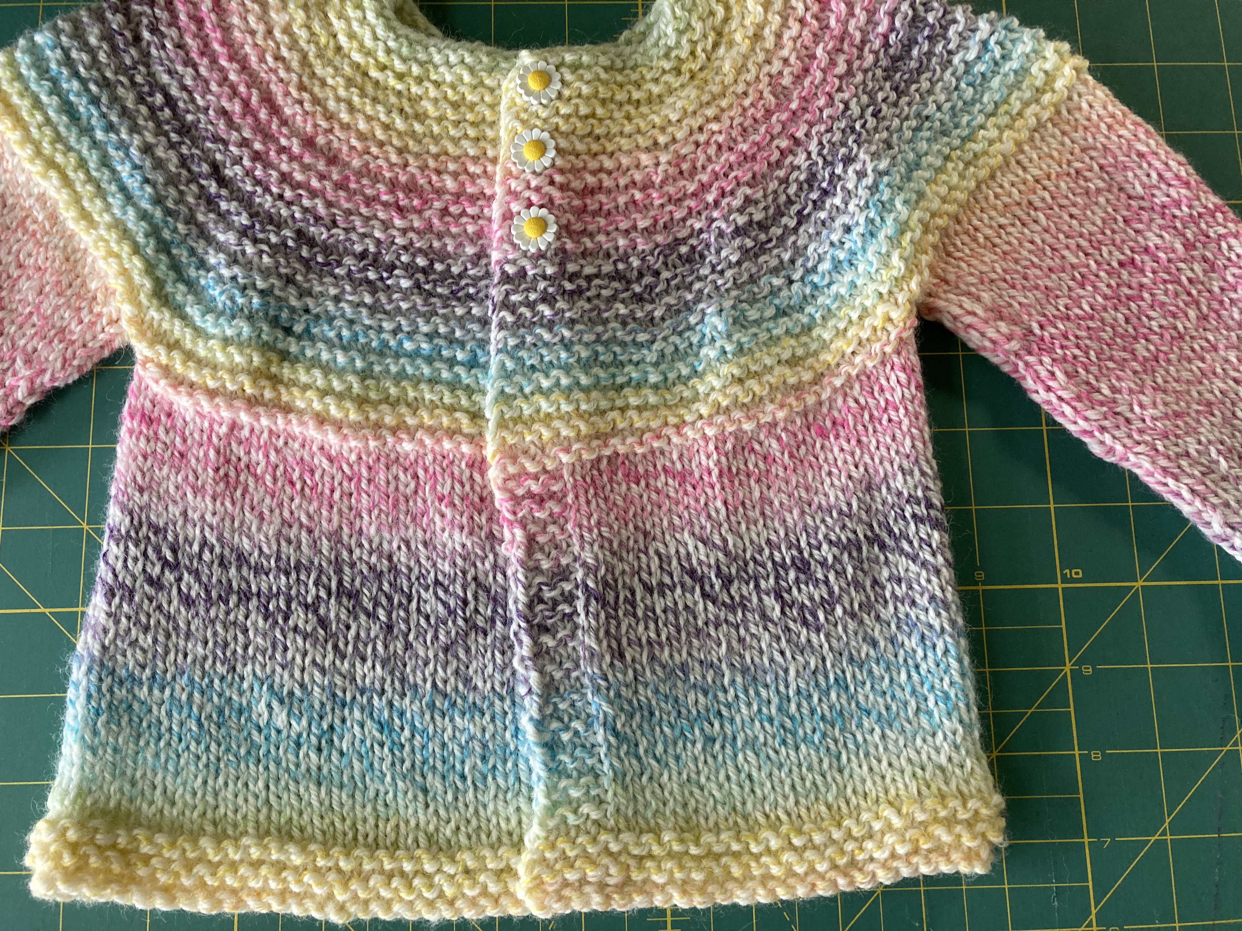 I found some daisy buttons for the yoked baby cardigan that I made with donated Plymouth Encore and it’s really cute! I have also washed and blocked the sweater and the hat. They’re ready for new homes. I have several items that I think I will be putting up for sale in the near future so that I can make some room in my studio for some new yarn. Ha! Ha! Like I need new yarn. I hope someone will want to have some mittens, hats and scarves that are knitted by me to give or to keep. What doesn’t sell will be donated to a good cause.