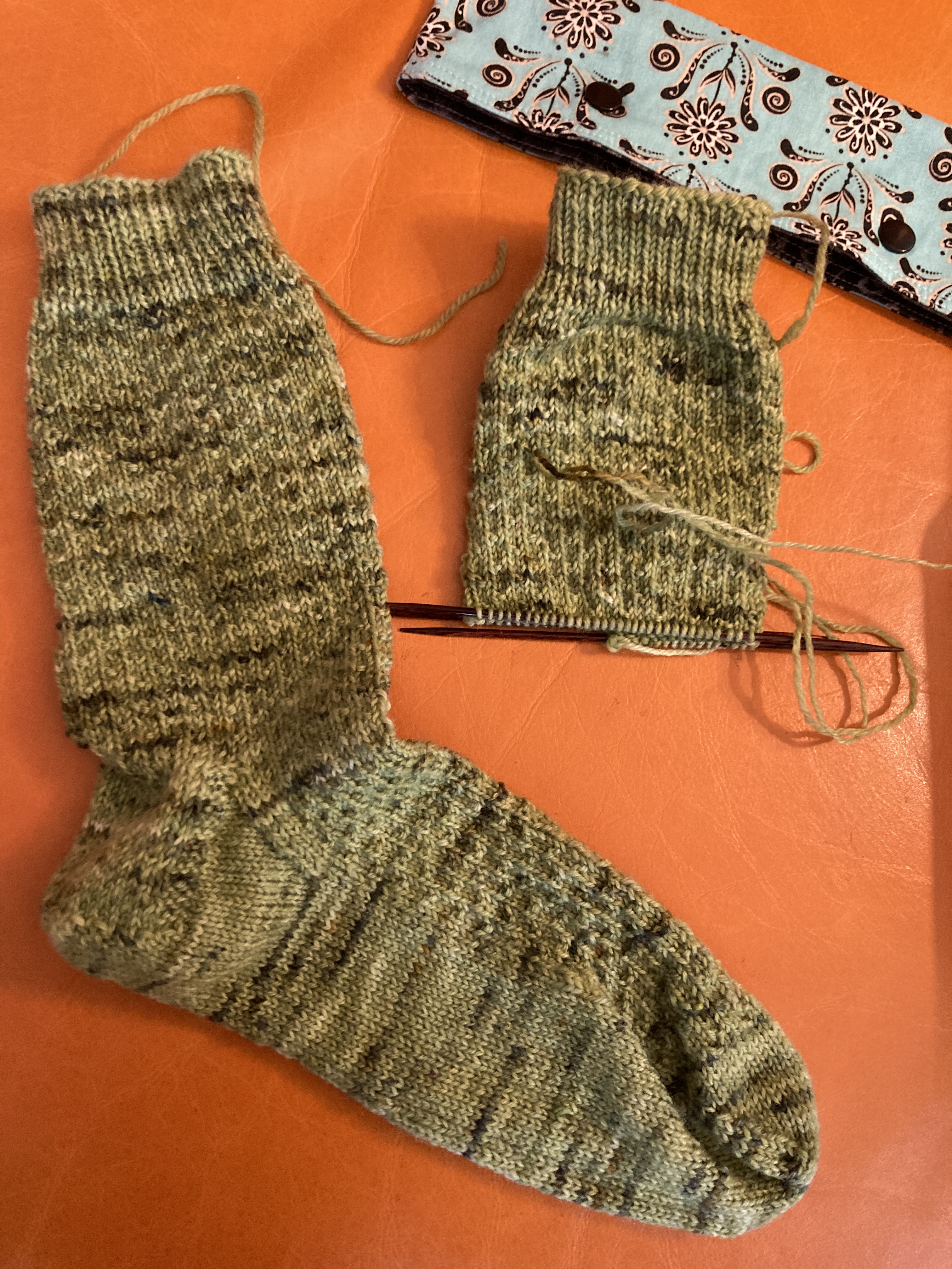 I am knitting away on several projects and have several more in the wings (that’s lined up on the shelf in my atelier). I’m working on my Hermione’s Everyday Socks in On the Round “Wicked” sock yarn. I am loving these socks. The colorway is spectacular and the pattern is soothing. (It’s also free on Ravelry!) They’re what I go to when I need something small to throw into my purse.