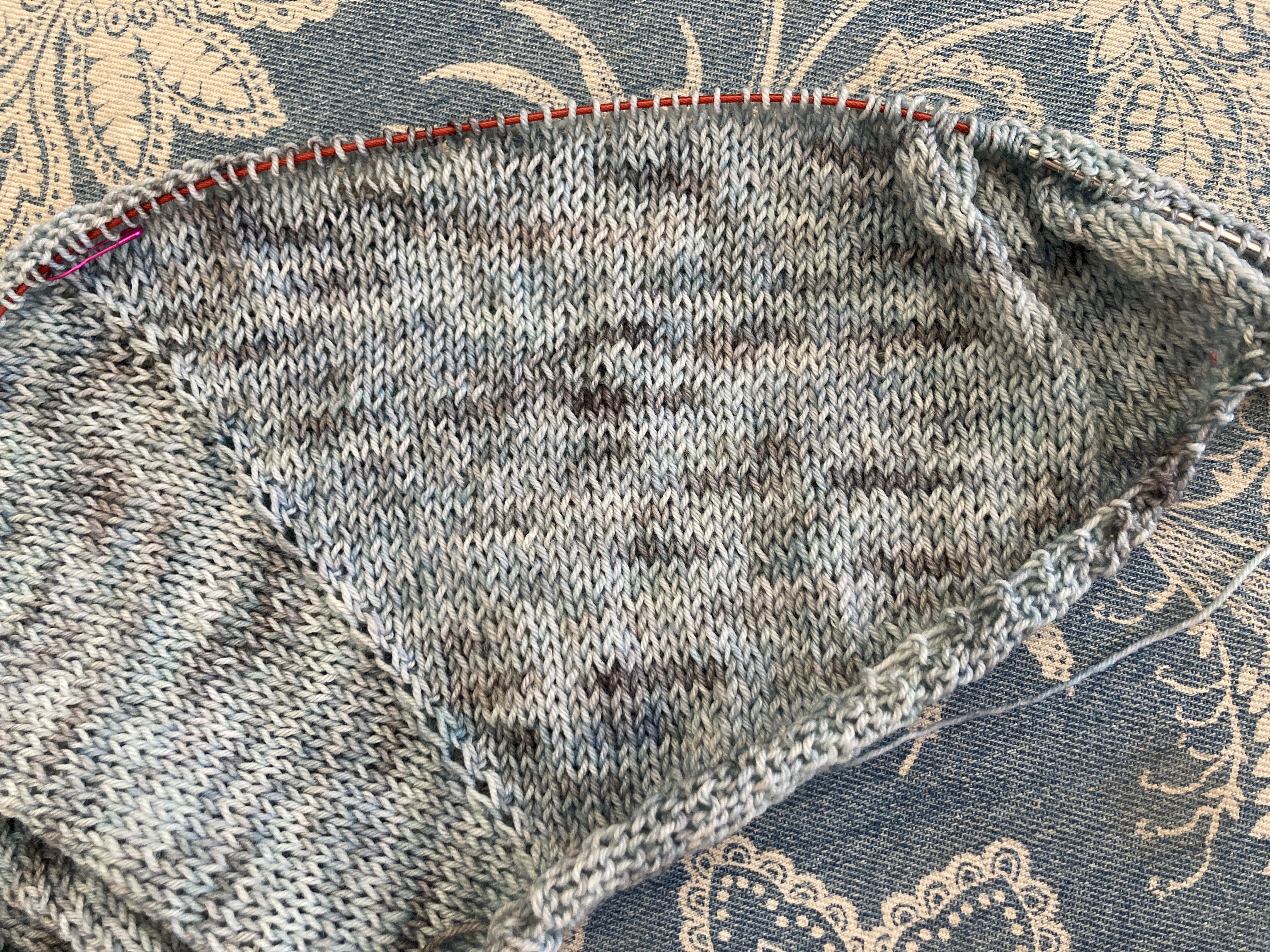 I cast on a new project yesterday, too. A pair of socks for my hubby for Christmas. He’ll watch me make them “with my class” and then will get them in his stocking this year. I’m knitting with HiKoo’s Madrona fingering weight yarn and a US 2 needle. The yarn is a combination of baby Alpaca, merino, bamboo and nylon and it’s super soft. He’ll love that they’re blue, his favorite color. AND I get to use another ball of stashed yarn. I missed making a pair of socks in October so these are my November Self-imposed Sock Club socks. I need to make some new socks for our granddaughter, too and since they’re small(er), I hope I can get more than one pair knitted in November.