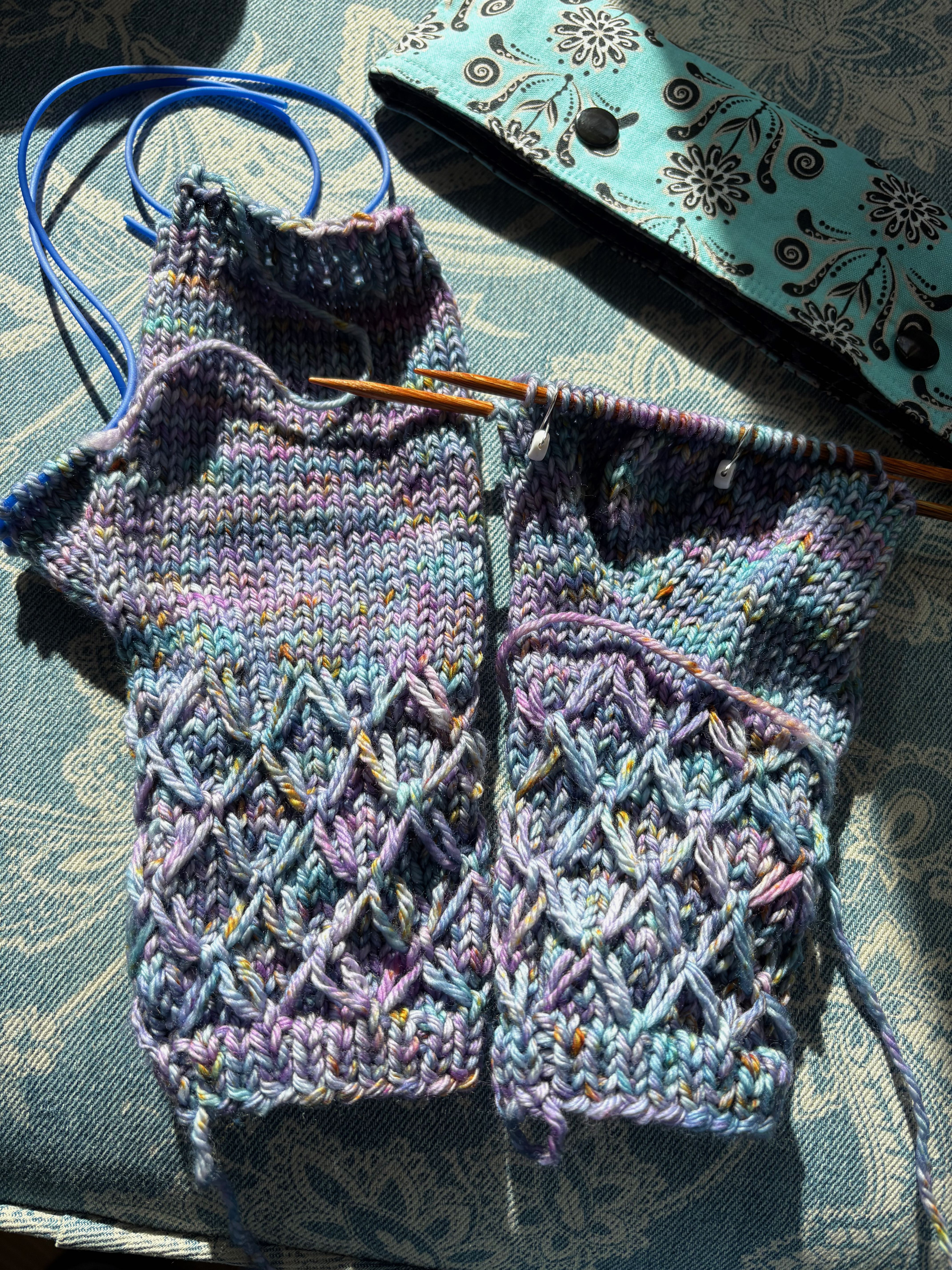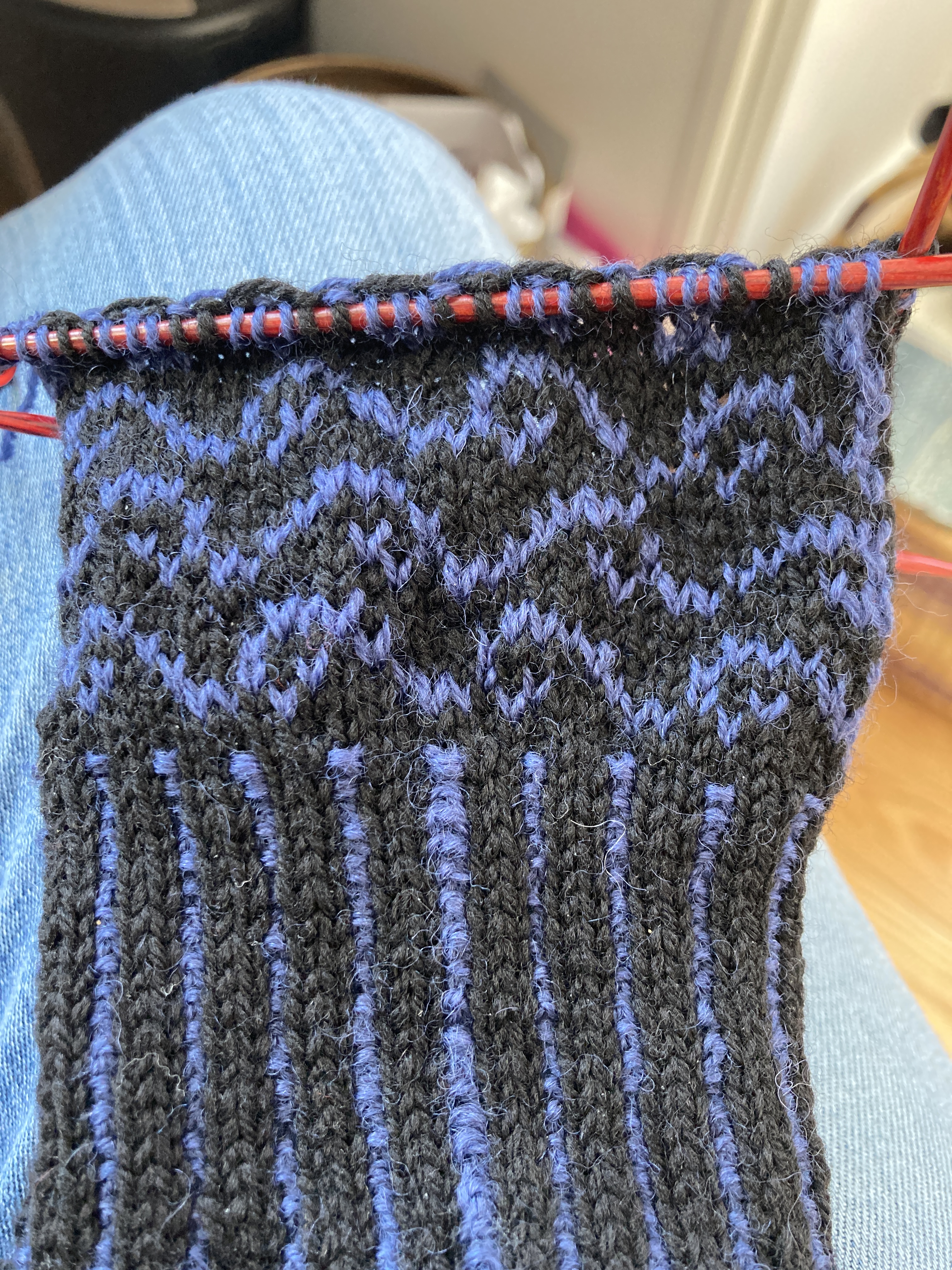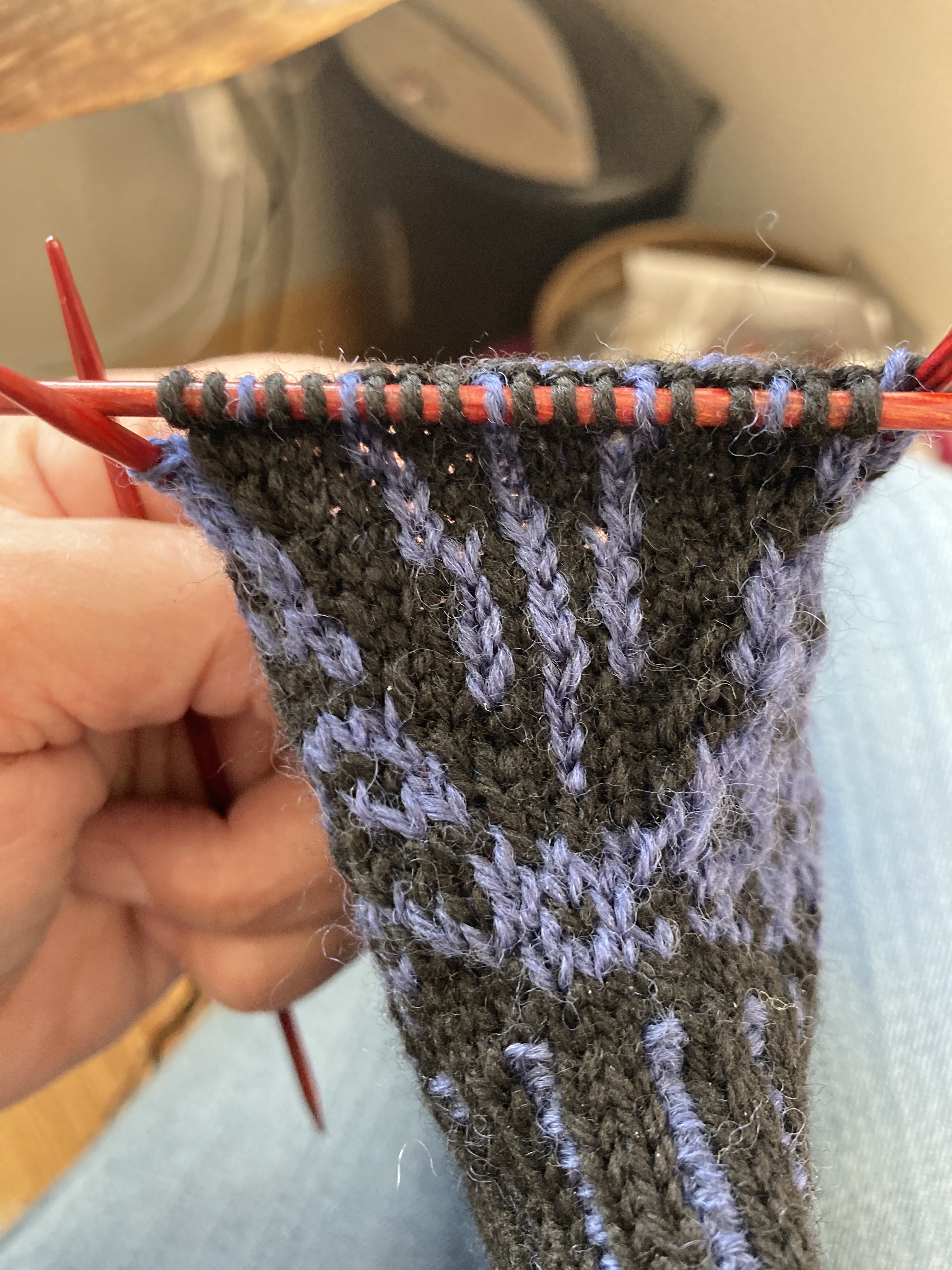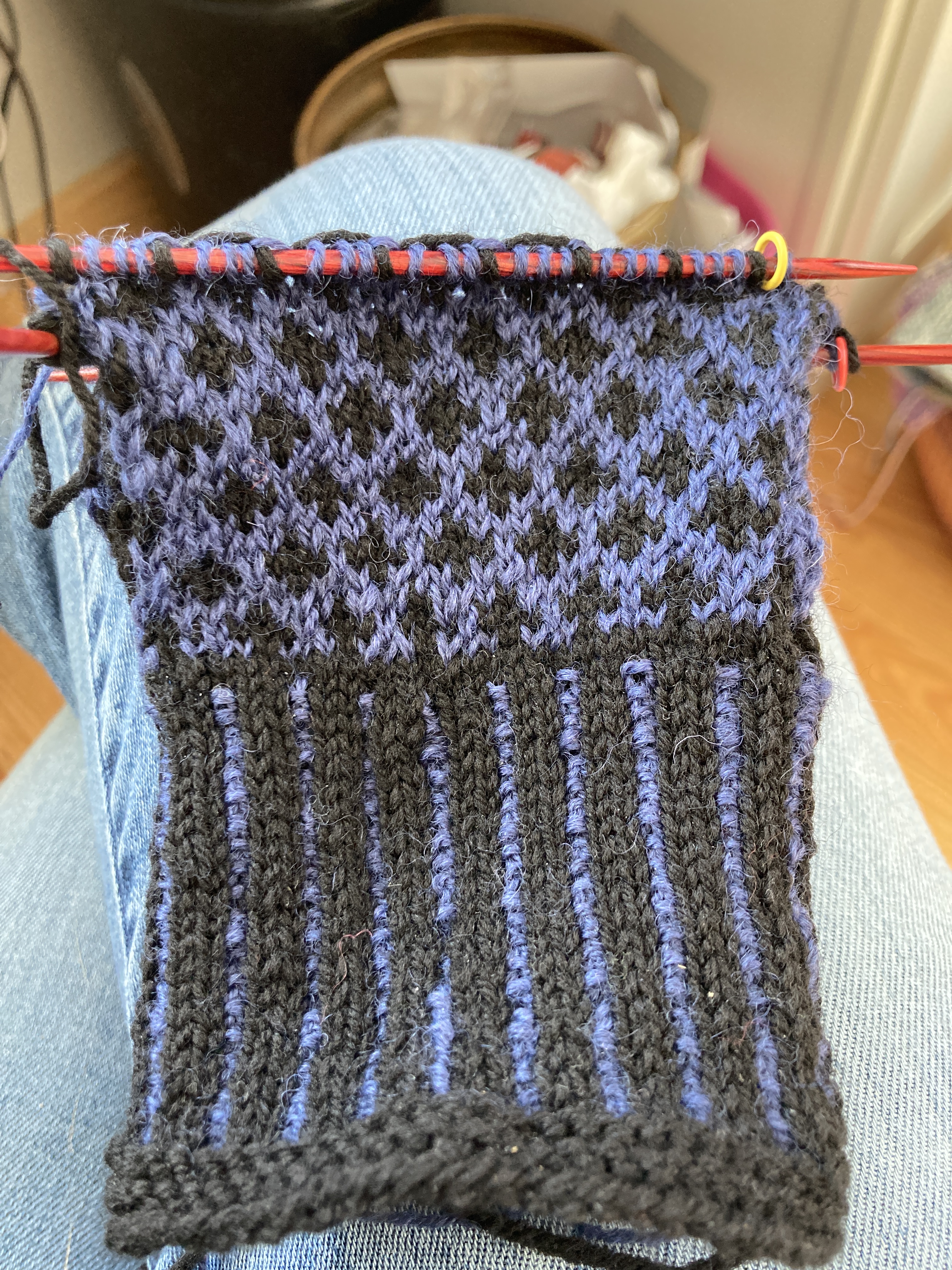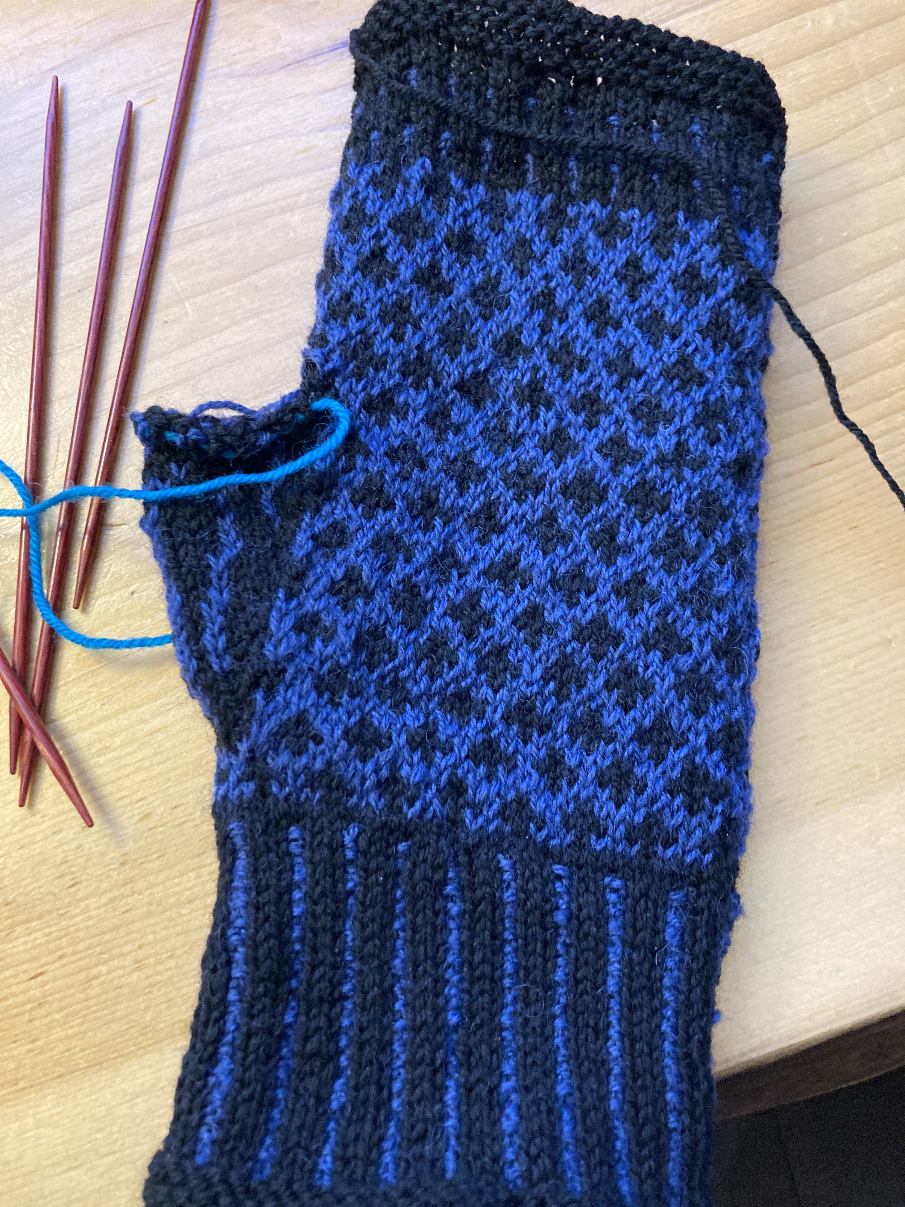 While I’ve been laying low, I’ve been on a finishing spree! I’m so happy to have several projects that have been on my needles in some form or another OFF the needles! The first one being the fingerless mitts for my daughter. She asked for a new pair a year ago, she chose her colors and the pattern and I started knitting. BUT I thought they’d be too big for her and was concerned so I waited to have her try them on when we were together … and then I forgot to have her try them on … twice, several months apart. So, I am finally finished knitting them and they are, as of this morning, dry after their bath and block. I am really happy with them and despite them being black and blue, they are quite stunning. I hope she’ll love them. I always hesitate to mail stuff to New York City because they do tend to get lost but I’ll ask her what she wants me to do. I’ll happily mail them to her or bring them to Thanksgiving.