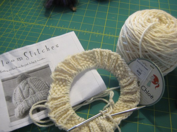 My Vintage Velvet scarf with its wonderful reversible cables is one. Second is the little hat that I started knitting yesterday and will finish today, Downton. It’s a free pattern on Ravelry. Check it out! Third is the fingerless mitts that I will finish (I hope) in time to submit that I am knitting along with the Jimmy Beans Wool Downton Abbey KAL “Lady Violet’s Dinner Gauntlets”. Despite the fact that I am not totally in love with the colorway, I like the project. (And it’s my first ever KAL!) Both the scarf and gauntlets can be seen in my previous post, Queen Bee WIP here.