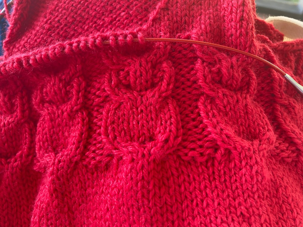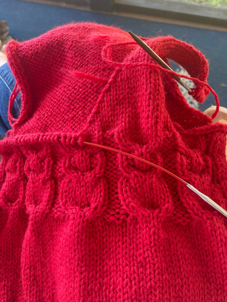I’m working on my Vanilla Sweater by Corrine at the Wooly Thistle in Rauma Garn Finull. I fell in love with the color of this yarn and had to buy it. No regrets here. This is a wooly Norwegian wool and I can already feel it softening up as I work it. I’m struggling to see my stitches though with the heathery wool and I’ve had to go back several times when I increased where I should not have. My attention span seems to be challenged right now. Lots going on, hubby away, boss away, the world on fire and I may even need a better light by my knitting chair.