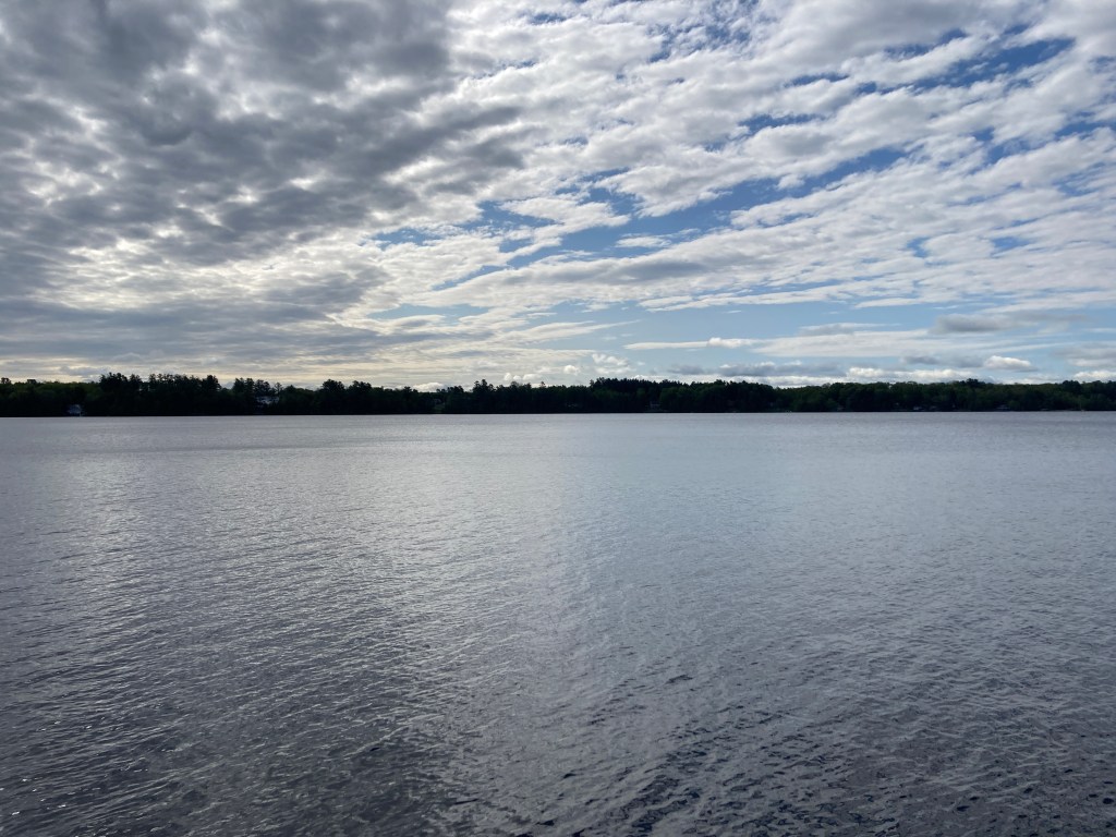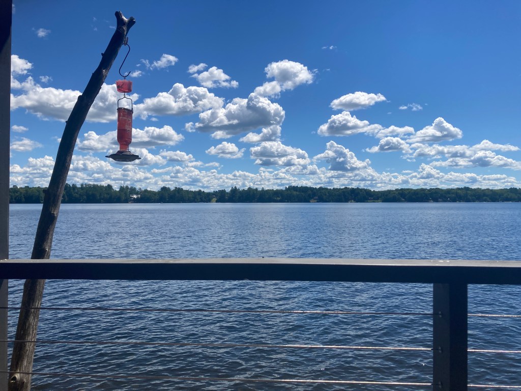 I have had a lovely, peaceful morning with my coffee and yarn on the porch. I got up without an alarm, took the dog out, fed the dog and took my coffee out to the porch. It was pretty gray and we even had a little sprinkle of rain. Since then, I went up to my atelier for my yarn and I’ve been sitting here drinking my coffee and knitting and listening to the sounds of the lake. The sounds of home. Hummingbirds chasing each other away from the feeder, ducks quacking by, the train passing heading south, and the splash of an osprey right in front of our boathouse (coming up with empty talons.) And now the sun is coming out and the bees are buzzing in the cat mint.