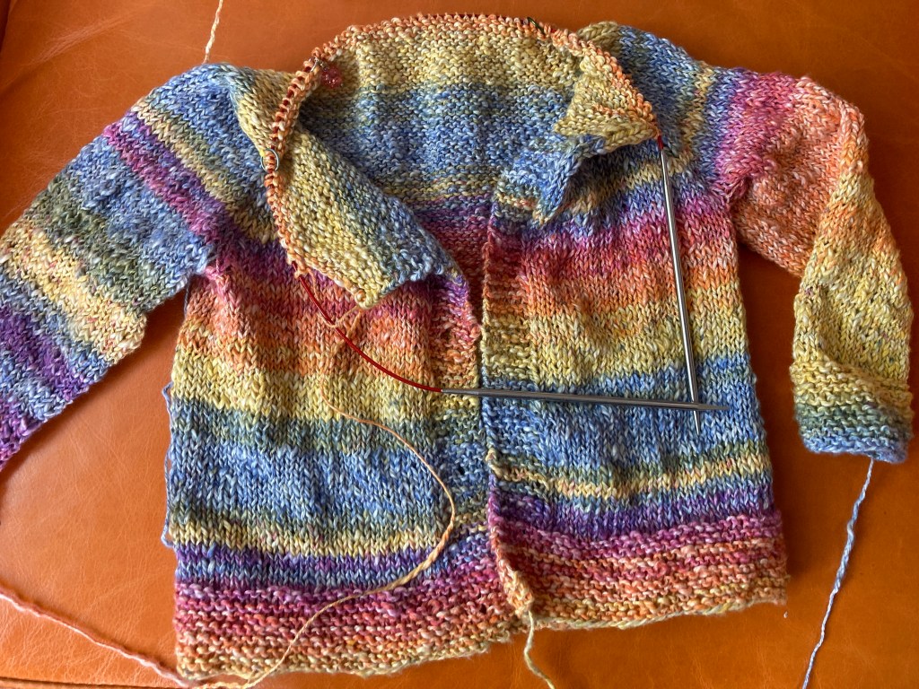 At work we have decided we need some more contemporary samples. I said I’d knit a Musselburgh hat and brought home a hank of fingering weight Yarn Snob yarn with neon pops of color. And then I thought about all the things I have going on and brought it back. I chose, instead, a hank of worsted weight yarn snob. There was enough yardage to make a toddler hat and the. I looked at the name of the colorway and that clinched it. I’m knitting this for a sample and then when it gets colder I’m taking it for Sylvie to wear in the city.