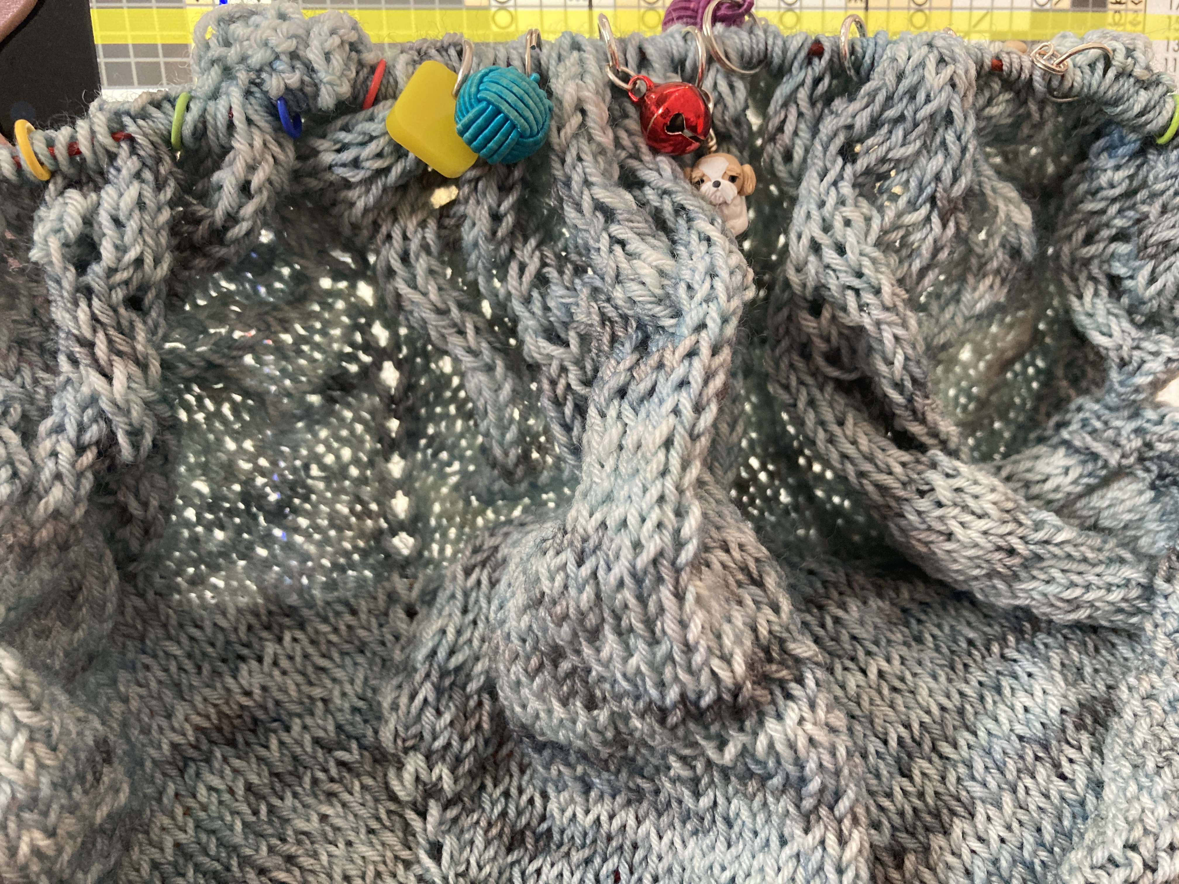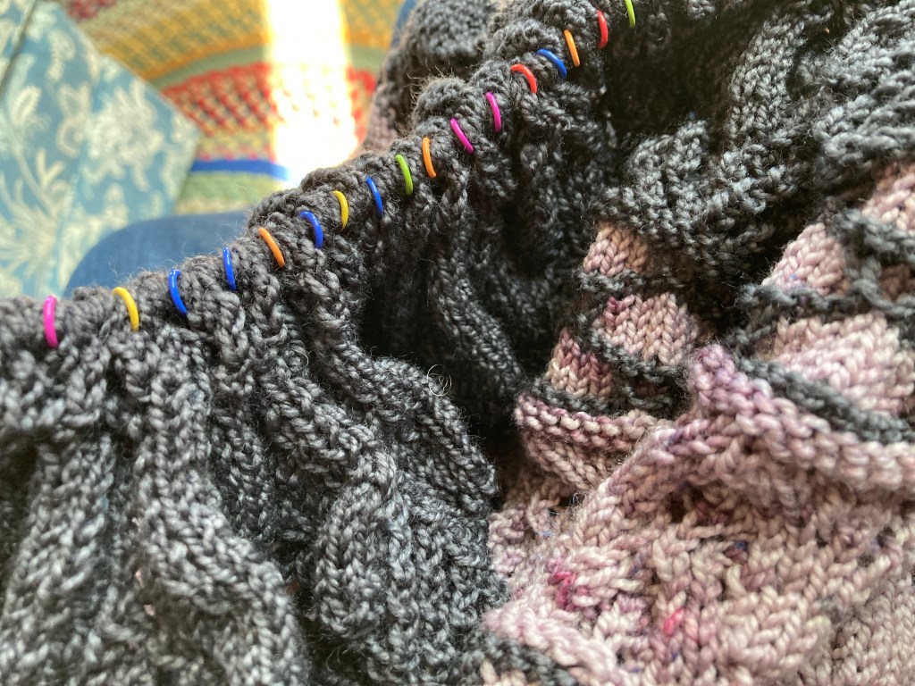 My SISC continues with Murmuration. Another pattern from the Sock Project book by Summer Lee. I may have already posted this photo but I repost it because there is a mistake here and the photo pointed it out. I’ve since frogged it back and added another (third) eyelet round to the third lace pattern. Good grief. My brain! My focus is definitely struggling with all that’s going on in the world. I am looking forward to our Rhode Island vacation next week and am planning to tune out and turn off social media for a few days to see if that helps my brain to focus. It’s all good in the end but good grief, I’m supposed to be an “expert” and a knitting teacher. I get frustrated with myself when I make such rookie mistakes!