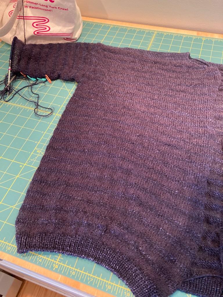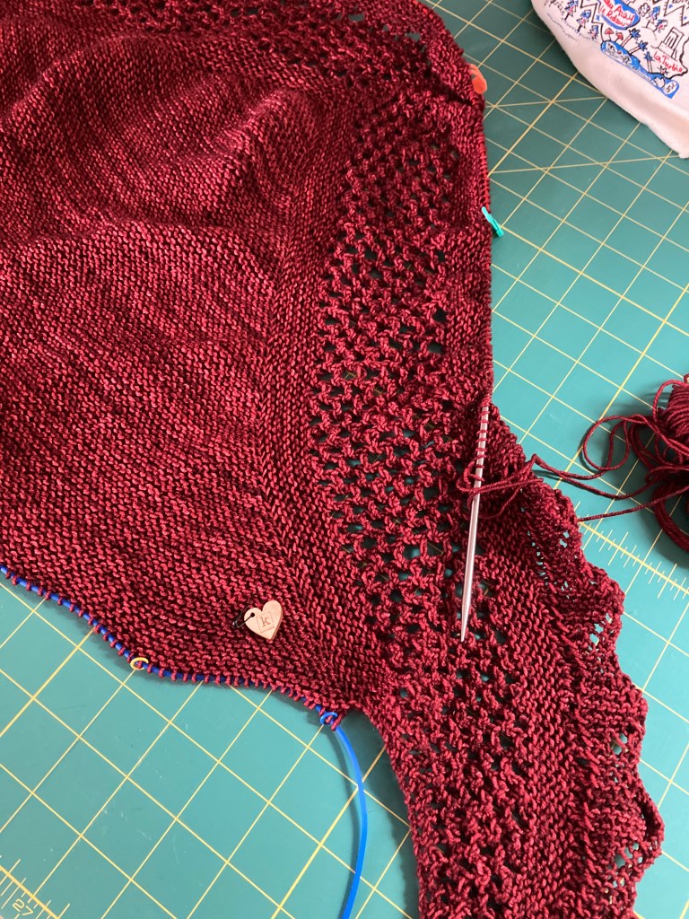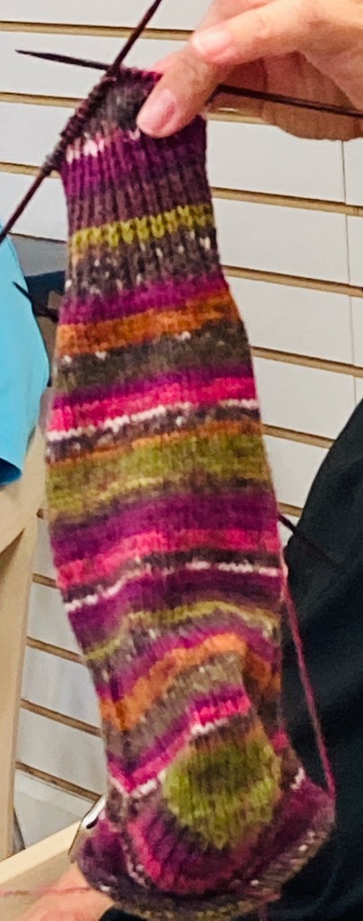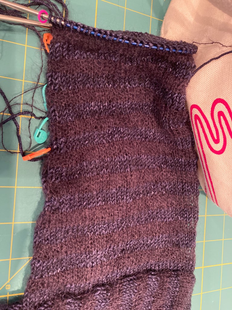 My SISC continues with Murmuration. Another pattern from the Sock Project book by Summer Lee. I may have already posted this photo but I repost it because there is a mistake here and the photo pointed it out. I’ve since frogged it back and added another (third) eyelet round to the third lace pattern. Good grief. My brain! My focus is definitely struggling with all that’s going on in the world. I am looking forward to our Rhode Island vacation next week and am planning to tune out and turn off social media for a few days to see if that helps my brain to focus. It’s all good in the end but good grief, I’m supposed to be an “expert” and a knitting teacher. I get frustrated with myself when I make such rookie mistakes!