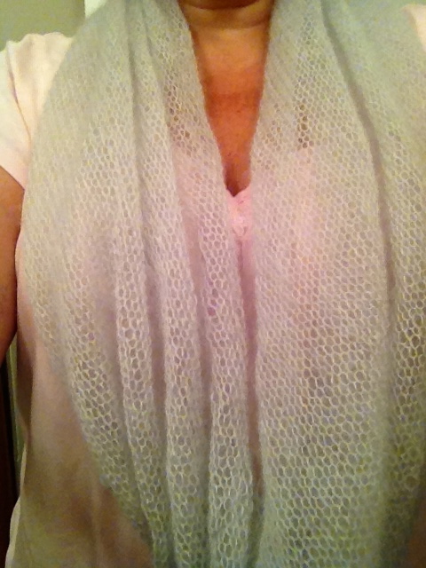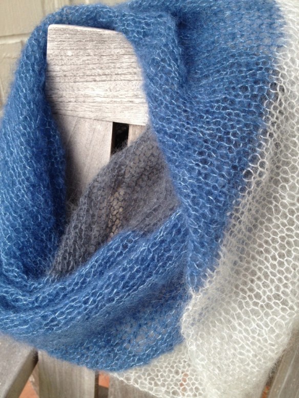 I have a new garment, that I’m calling a Three Shades Cowl. I’m making it for a customer in New York State. She wanted a cowl similar to the silver one that I knitted up but we decided to knit it in three colors. You saw the three colors in the last post that I wrote (here.)