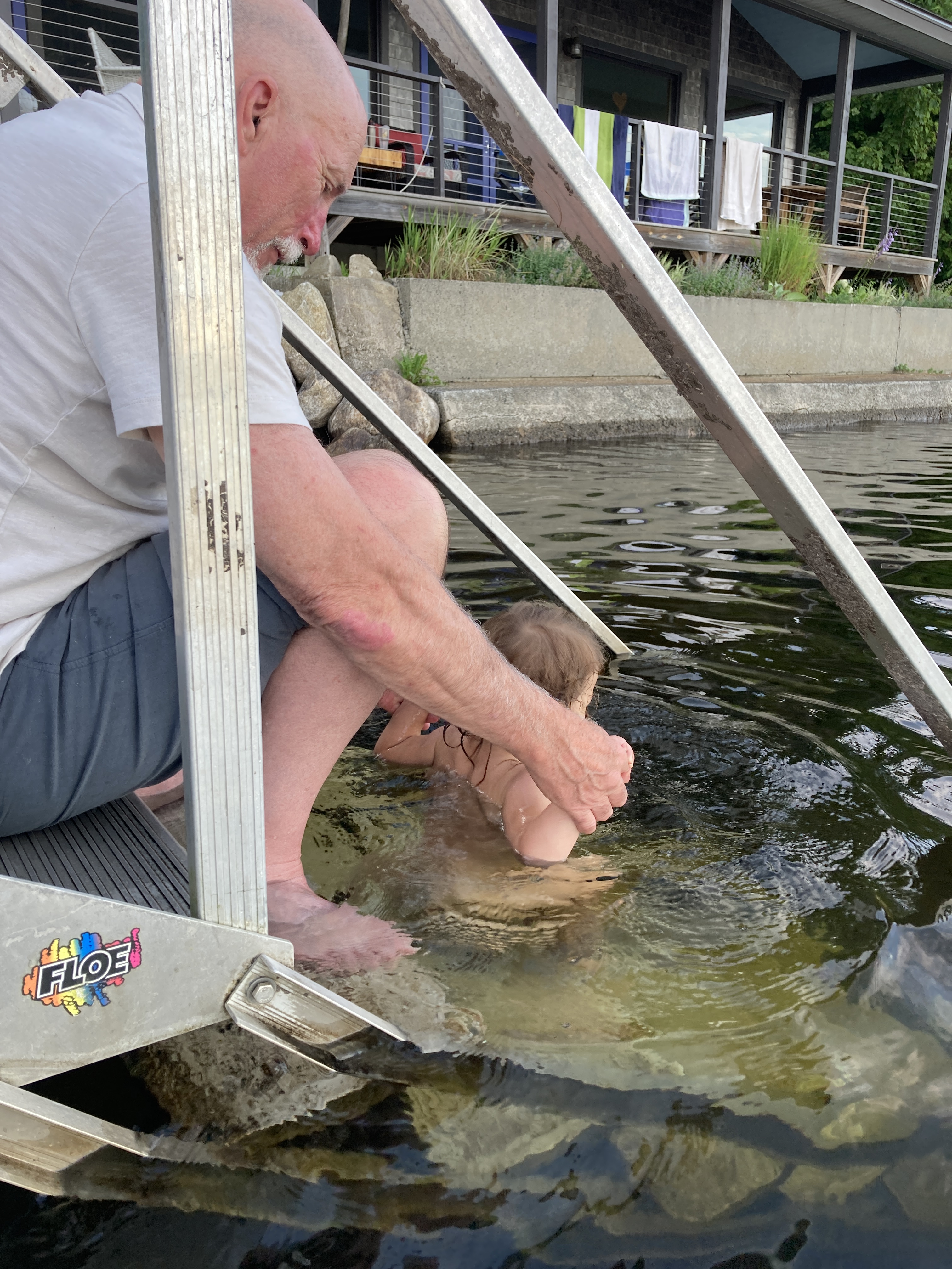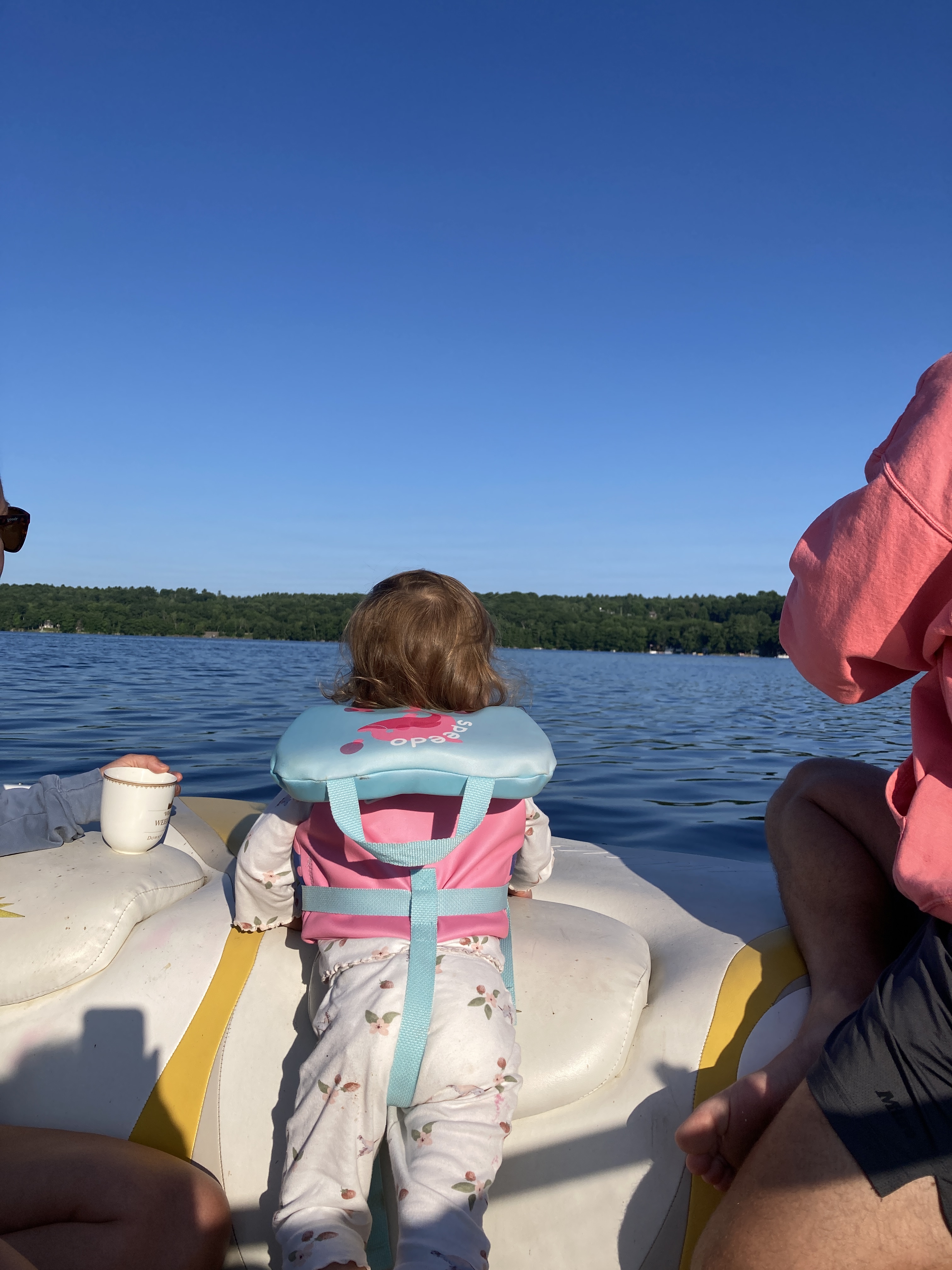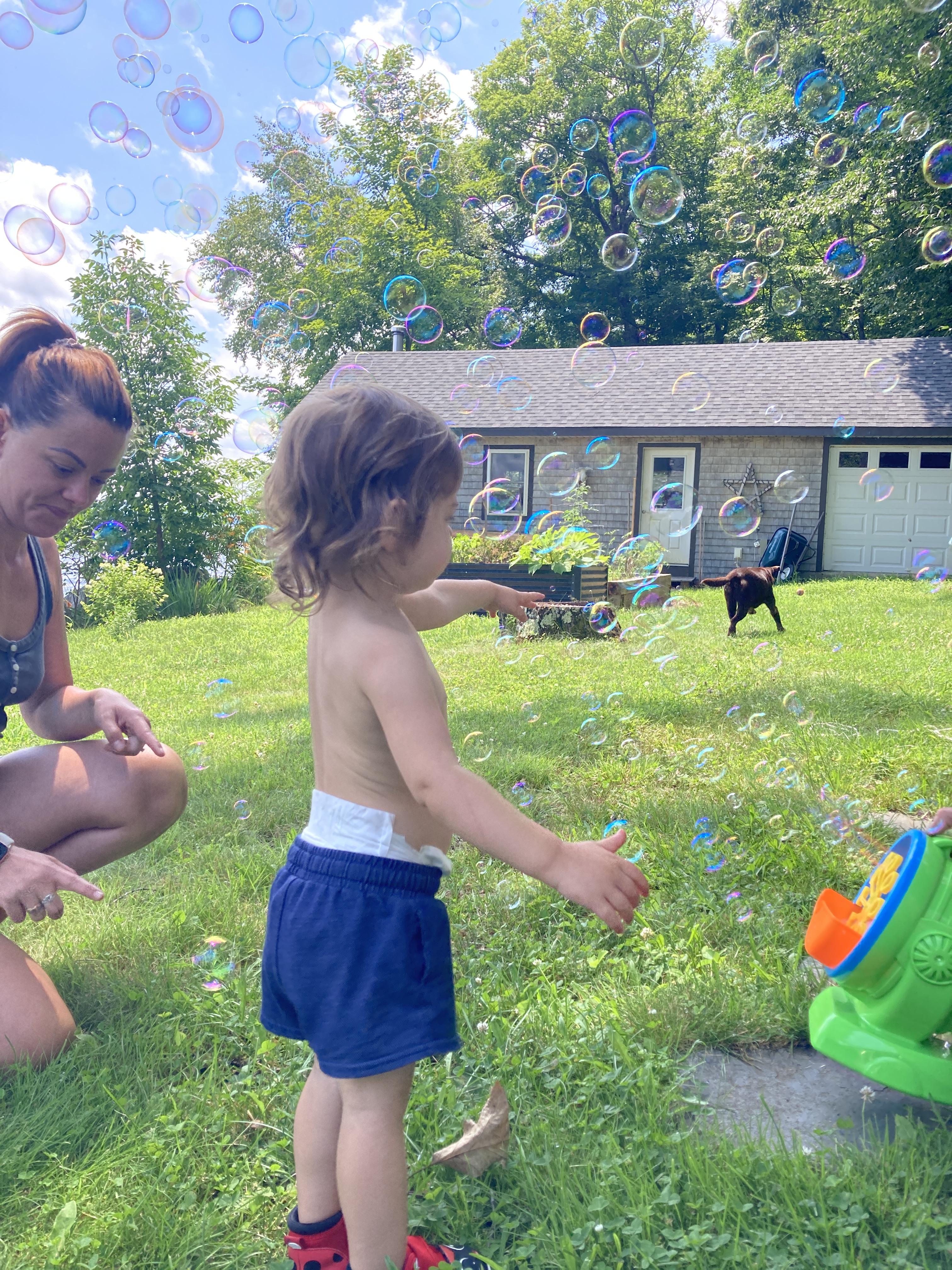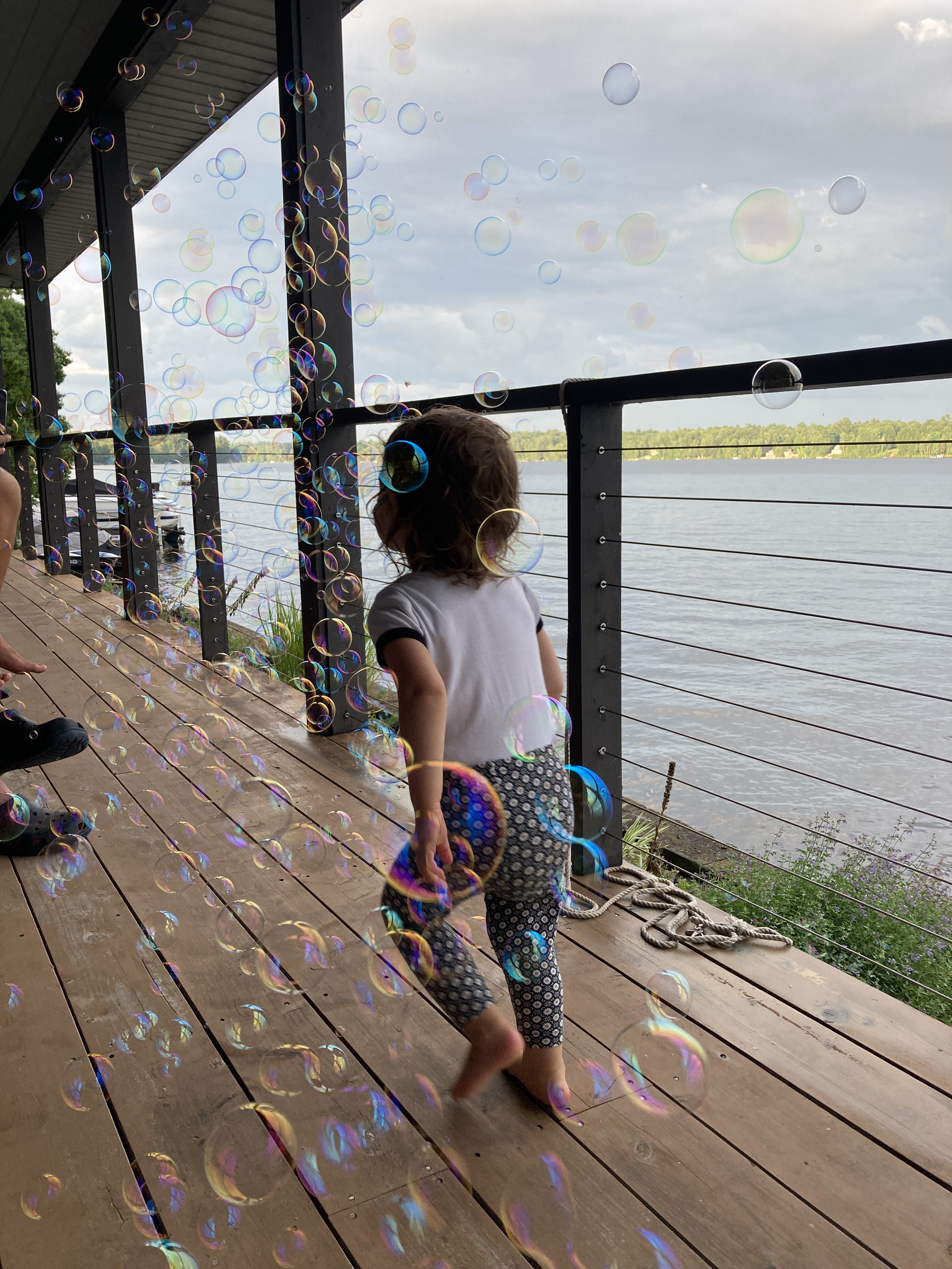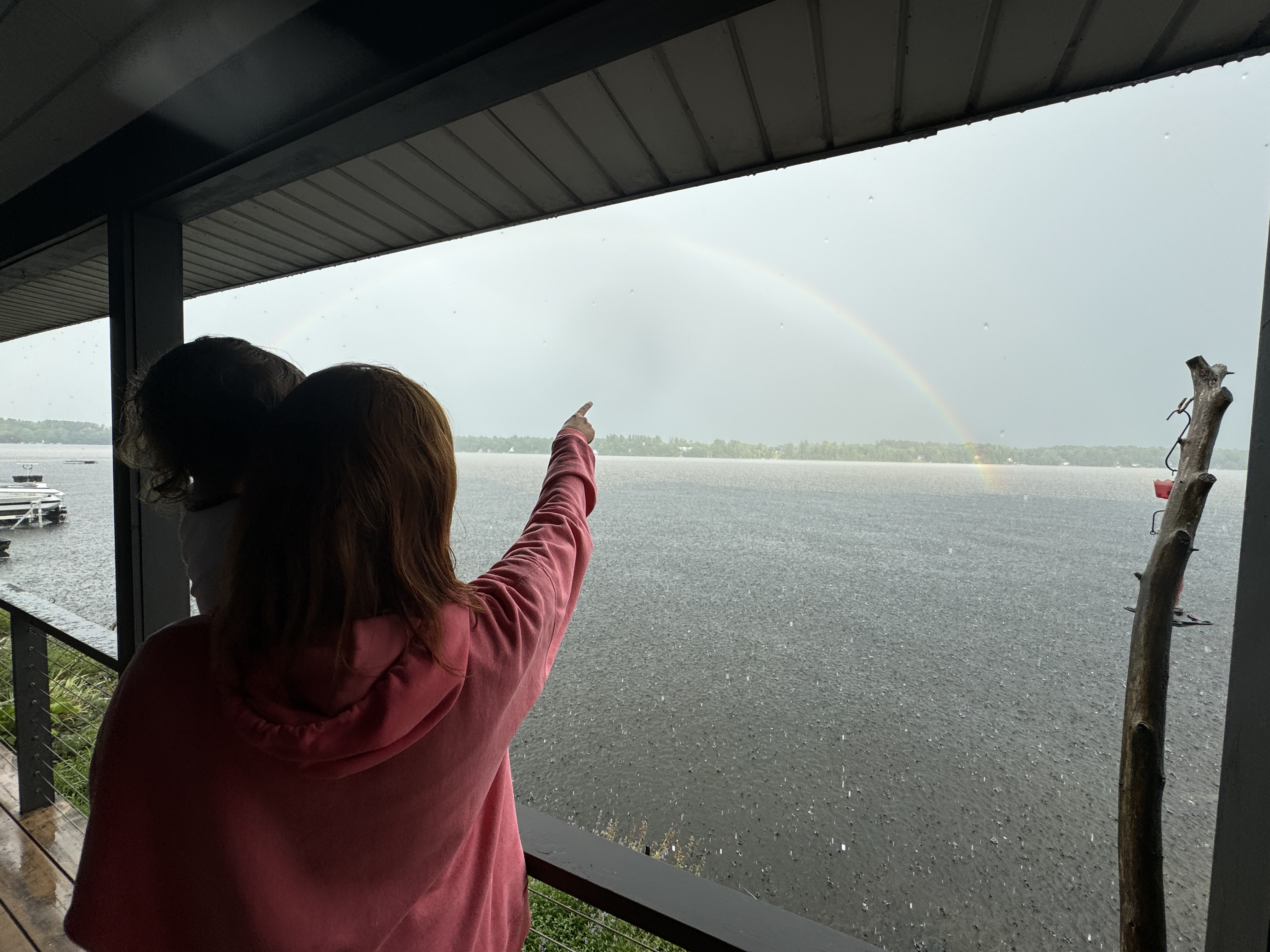 Today we’re back to my hubby and me. We’ve had the most excellent family time at our house for the last (almost) two weeks. My eldest daughter, Kate, and her husband and our granddaughter arrived last Tuesday and my son arrived Tuesday night with his two doggos. We had lots of fun swimming, playing with bubbles, visiting some fun spots and eating SO much great food. We’re early to bed and early to rise around here and the kids, despite their NYC lives, always fall into it, too. Coffee on the porch, blueberry picking, Belgrade Lakes Farmer’s Market … and did I mention swimming? Sylvie is a little fish! She loved the lake and became more and more confident over the time she was here – even confident enough to “fall” in twice on their last day. Of course we were right there to pull her out but we also have to let her fall so she knows the truth about the lake – it is fun and wonderful but it’s also frightening. (She was not a fan of falling in.) We went on some fun boat rides, saw eagles, counted loons, and we tried (and failed) to outrun a rain storm but arrived home safe, sound and in time to see a full rainbow across the lake.
