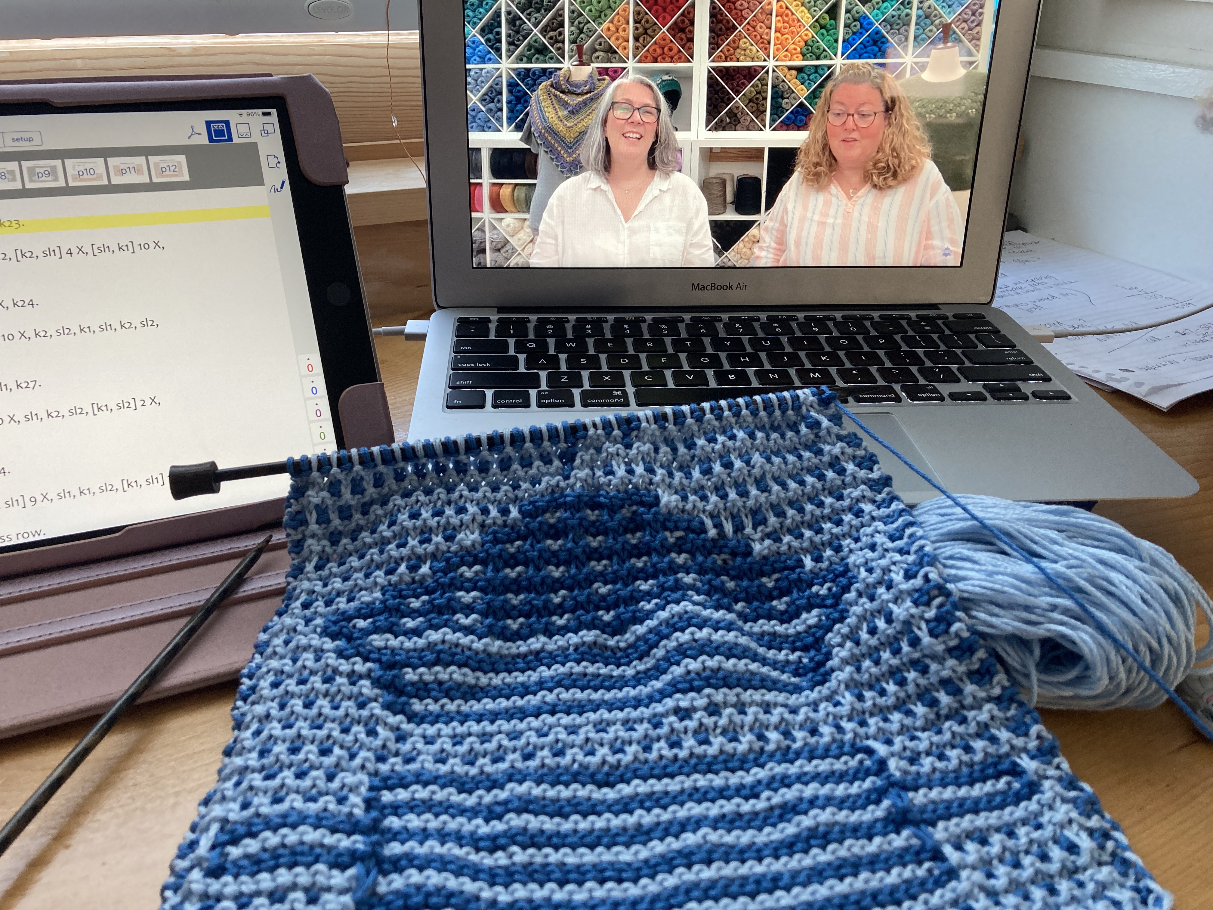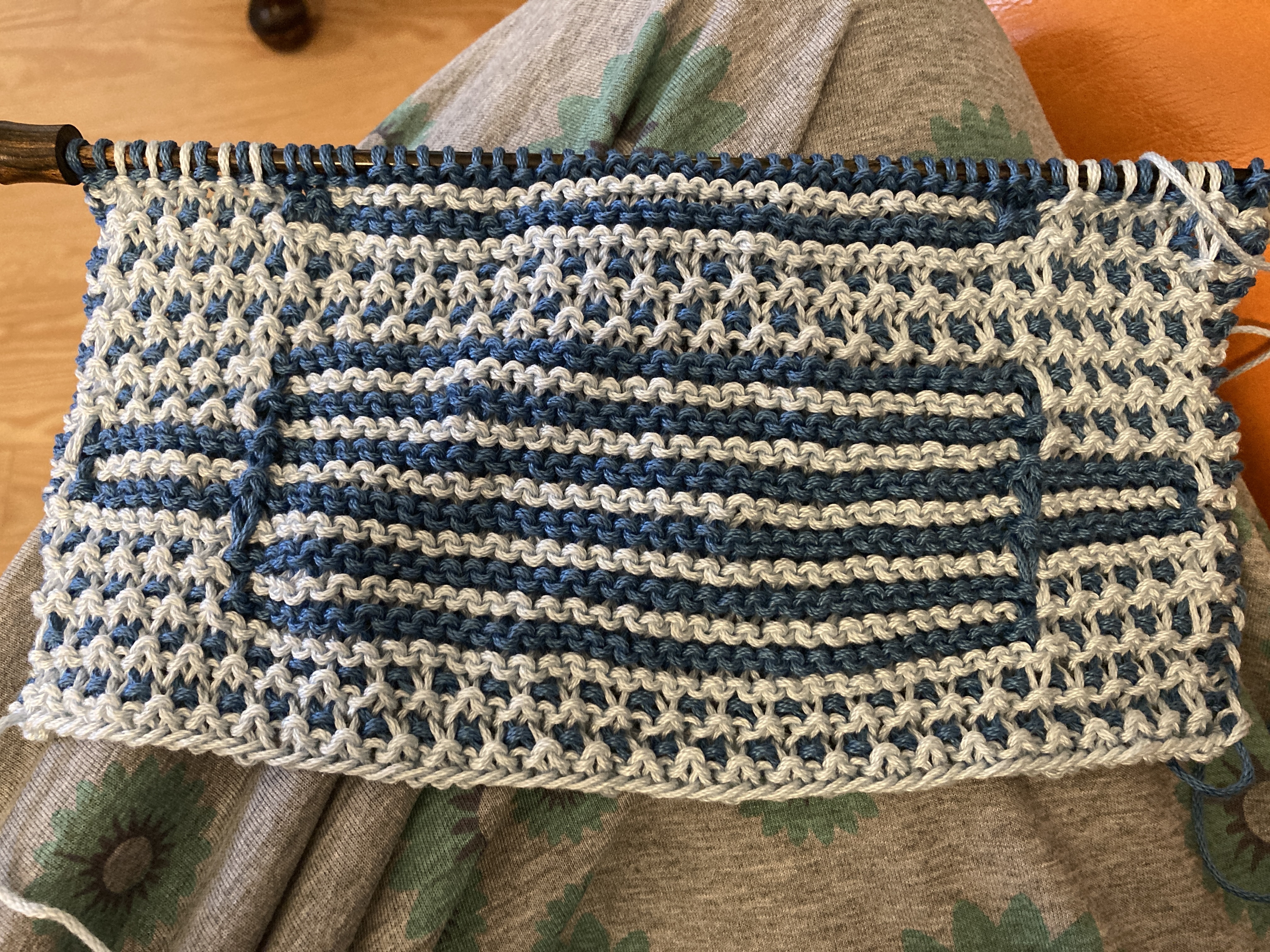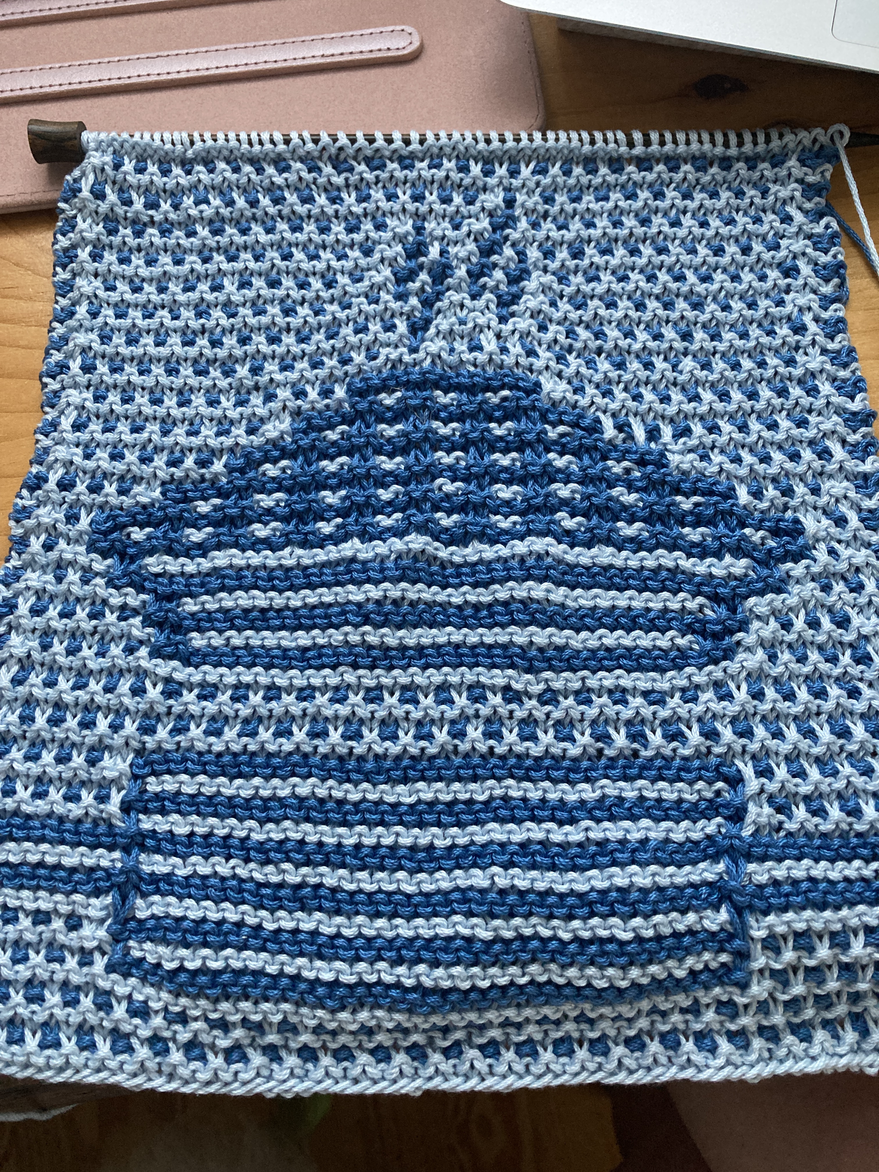 I spent a block of time yesterday in my atelier catching up with some of my favorite YouTube channels and knitting on my Lattice Have Pie kitchen towel that I’m knitting for my step-daughter. I am really having fun with this project. The yarn is Tahki Stacy Charles Classic Cotton and I chose two colors of blue because her wedding colors were blue and white. I didn’t want to make a white or even partially white dish towel. Yuck. I’m working this on a US7/4.5mm straight needle since it’s all back and forth and slipped stitches are so much fun! There’s not one fancy complicated stranded row in the whole caboodle. I find it relaxing working on this project and I can see doing more.