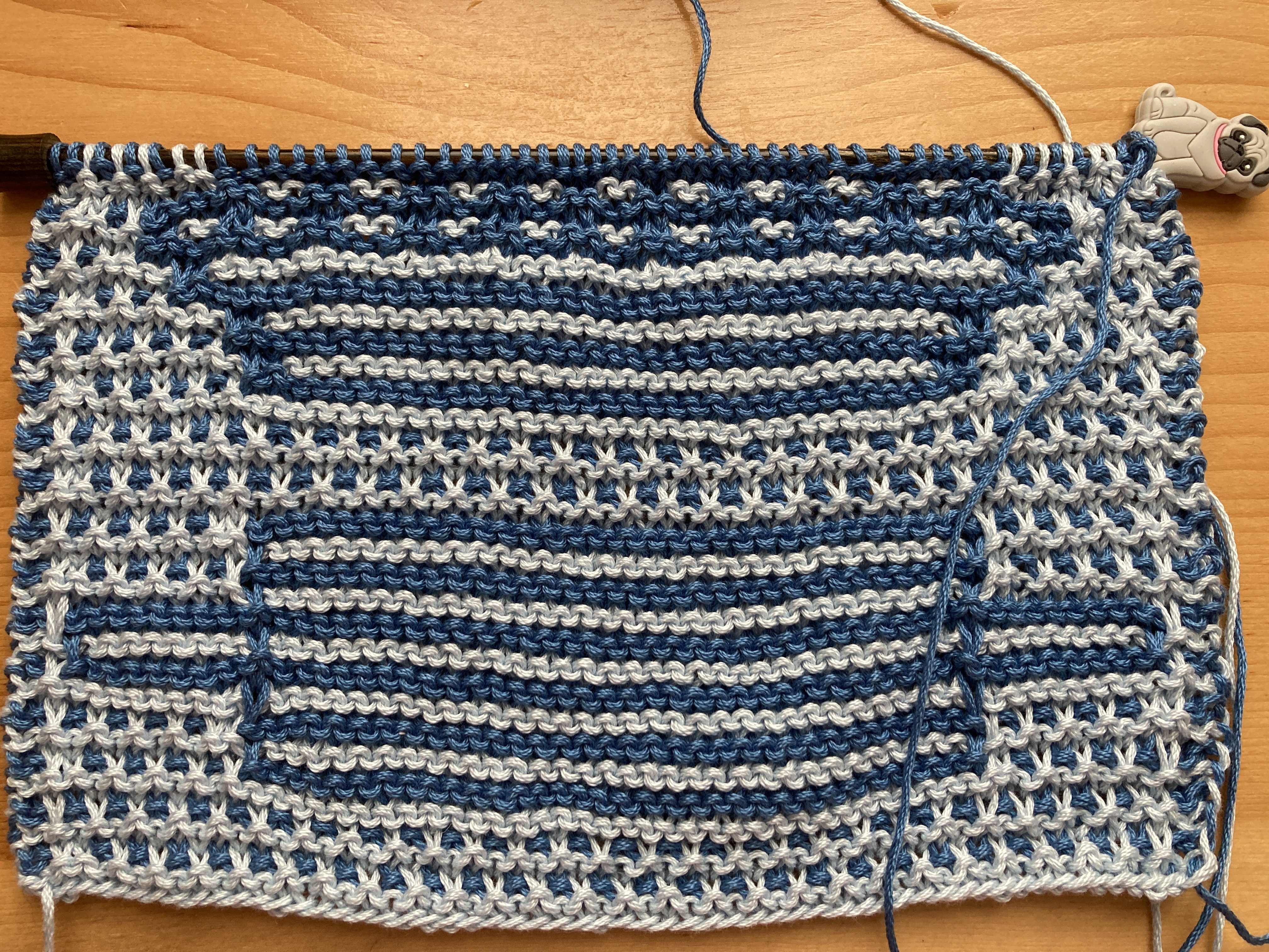 The pattern is a purchased pattern on Ravelry and it has charted and written instructions. The process is simple enough – follow the steps on the first pattern row and then knit the knit stitches and slip the slipped stitches. Easy as … pie!