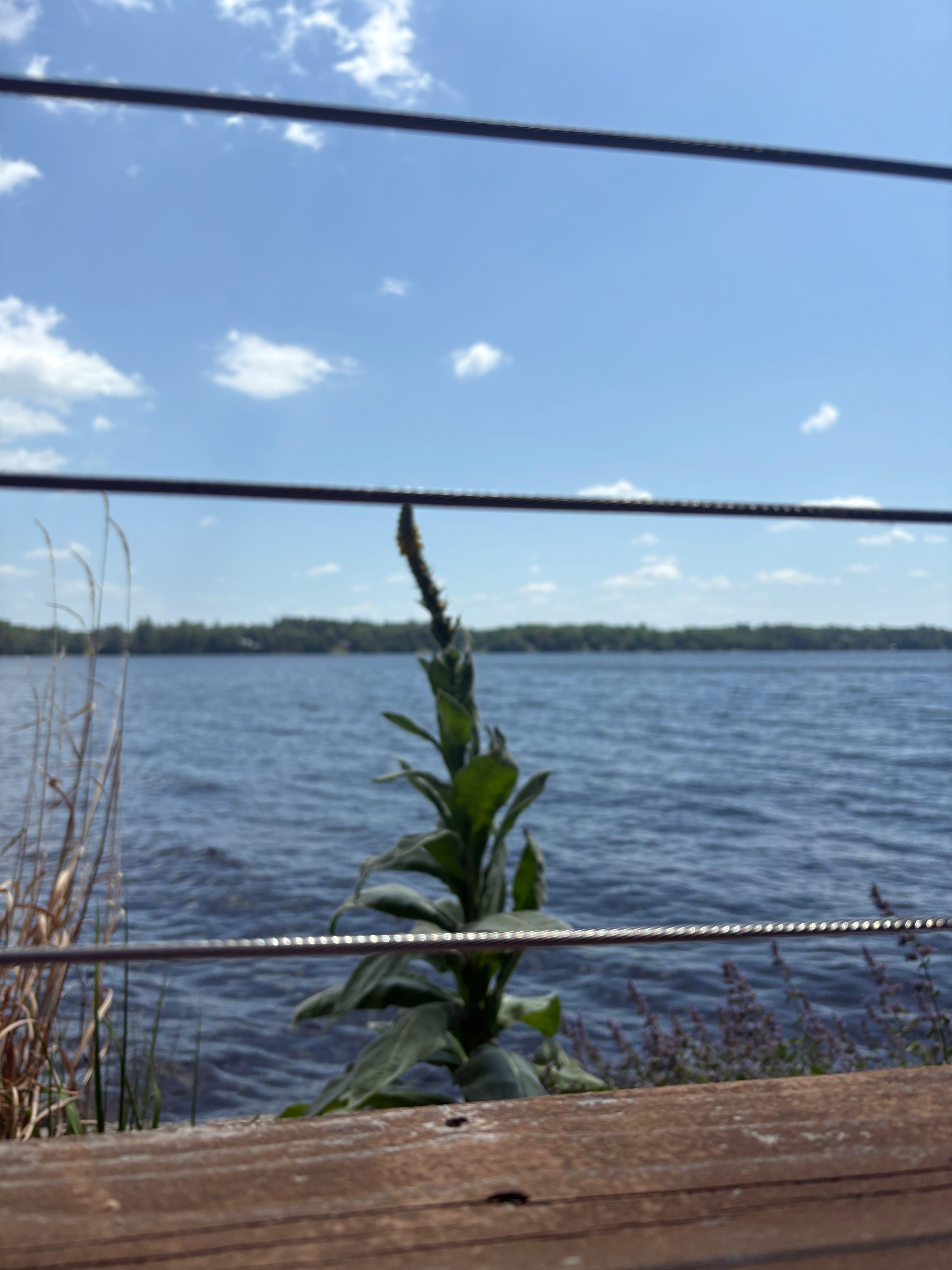 I’m taking the time to blog today because we’ve been busy getting projects done and the sun came out! Today it was beautiful and sunny and the lake was calm for coffee on the porch. My mullein plant is getting really big and soon (maybe tomorrow) I’m going to pick a leaf or two to make a tincture. Mullein is supposed to be good for the respiratory system and anybody who knows me knows that my respiratory system is challenged by allergies and a chronic allergic cough.