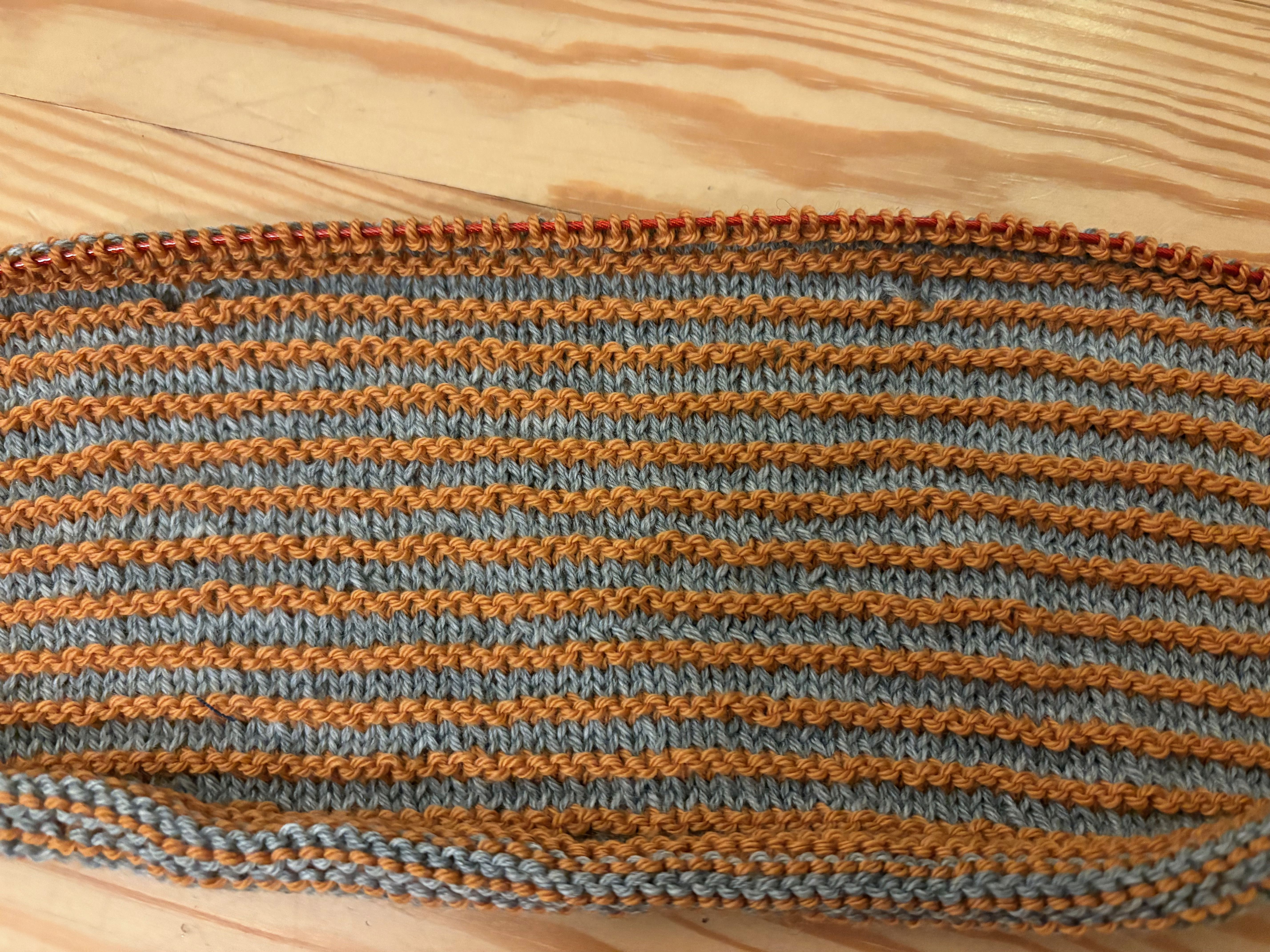 I cast on the second outfit for Dolores. This one is a caftan designed by Franklin Habit. So far, it’s a breeze of stripes with one row that has a pair of eyelets. Yesterday I reached the point where I am going to divide for the neck/shoulders but I didn’t have any stitch holders or scrap yarn with me so I put it on hold and I’ll work on it again later today. I can’t imagine that it’ll take too much time to wrap this one up. It does make me giggle and I am thinking I may need to have some hangers to display her outfits near where she ends up living in my house. Time will tell. It’s a shame to put these fun and funny outfits away once they’re made, right? When the granddaughter gets older she’s going to love playing with her.