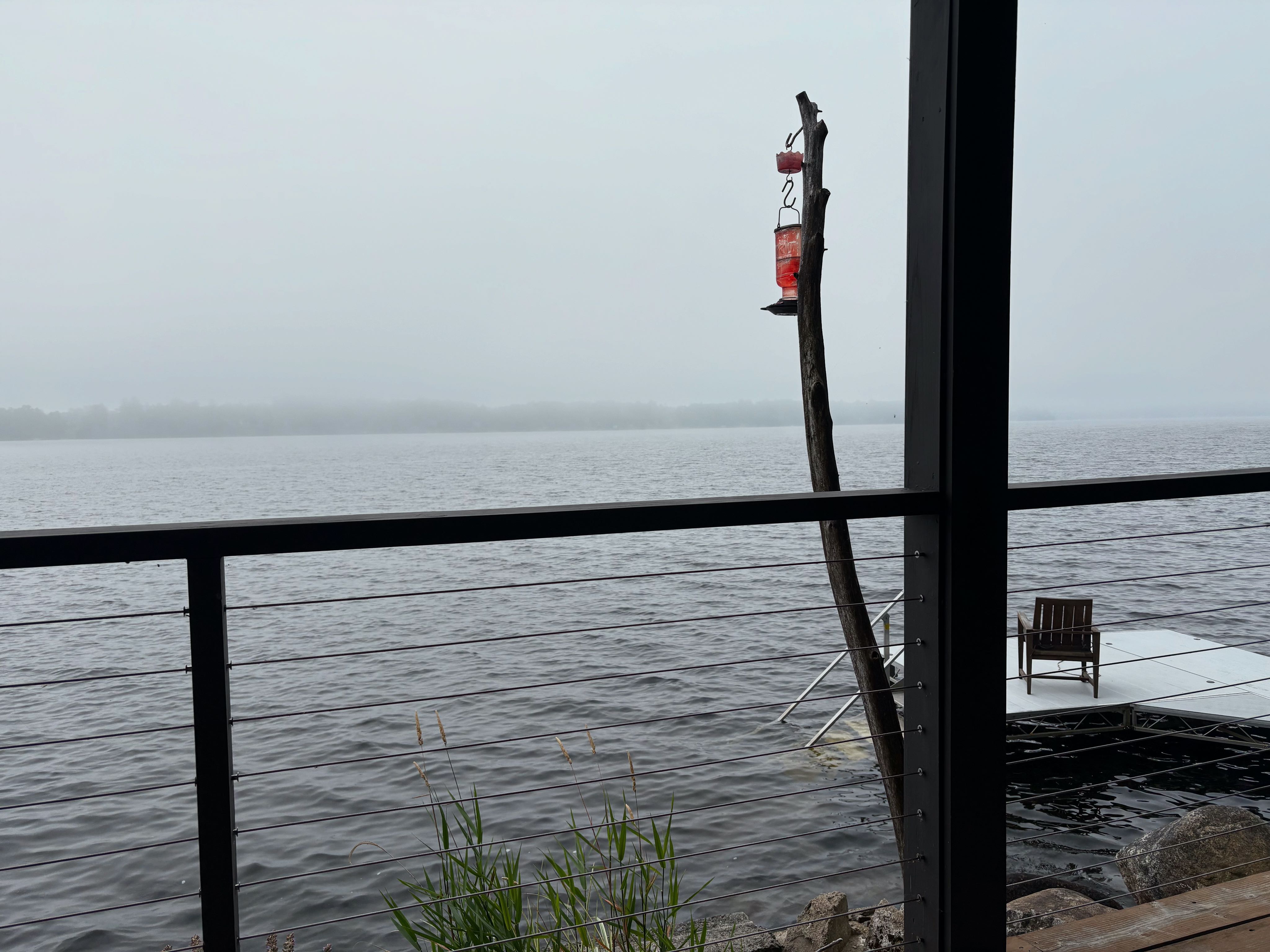 It started out well! and kept getting better! We both slept until nearly 7am and then spent a glorious hour-ish having coffee on the porch. Our first visitor was an osprey fishing and then “our” little loon family came by. The parents left the chick in front of our house for a bit (see below). They must think we’re trustworthy chick-sitters. “Our” hummers have been really busy, too. Activity was constant the whole time I was on the porch. We must have five hummingbirds (or more) but you start to recognize them after watching them so intently over the months.