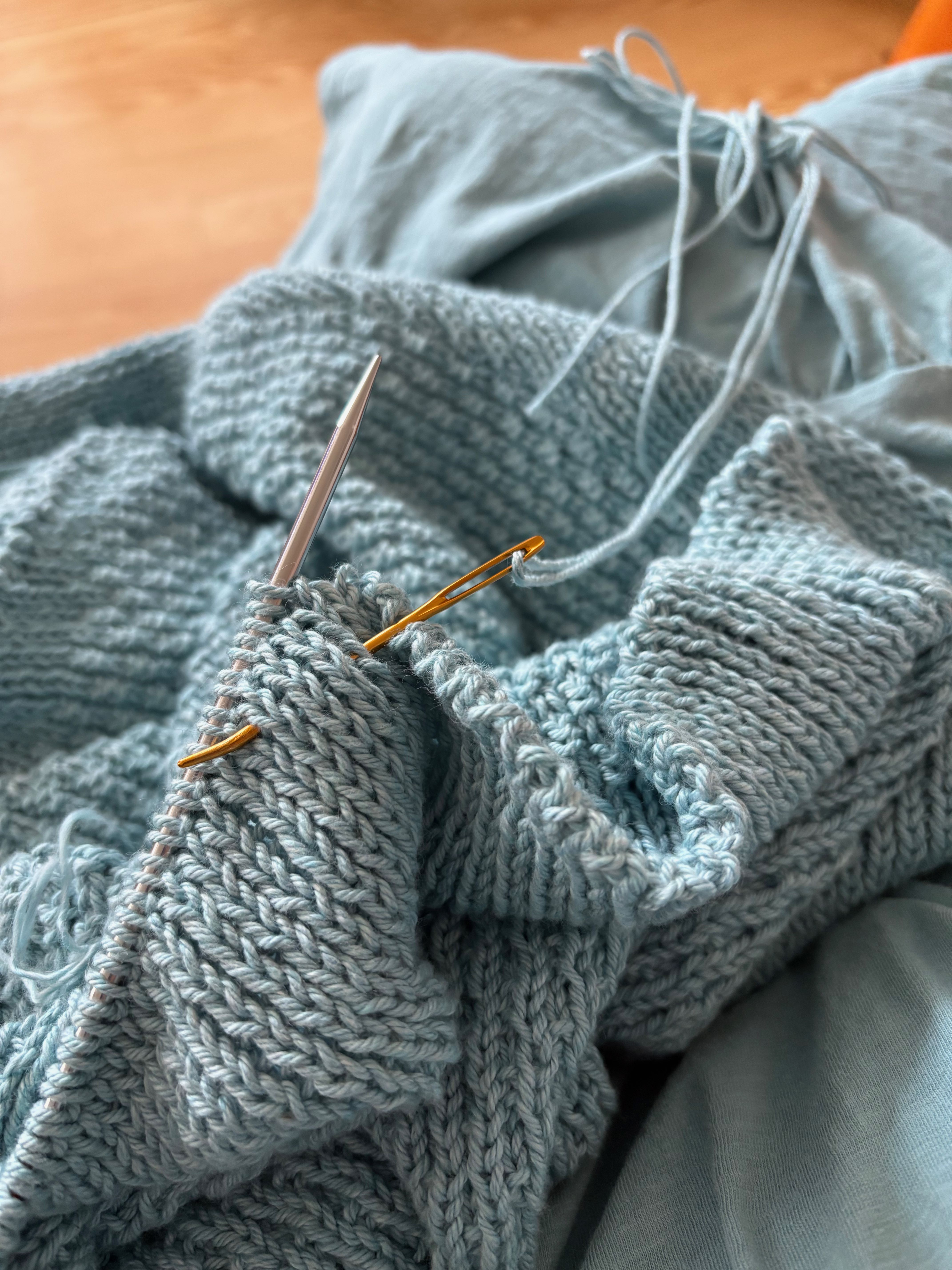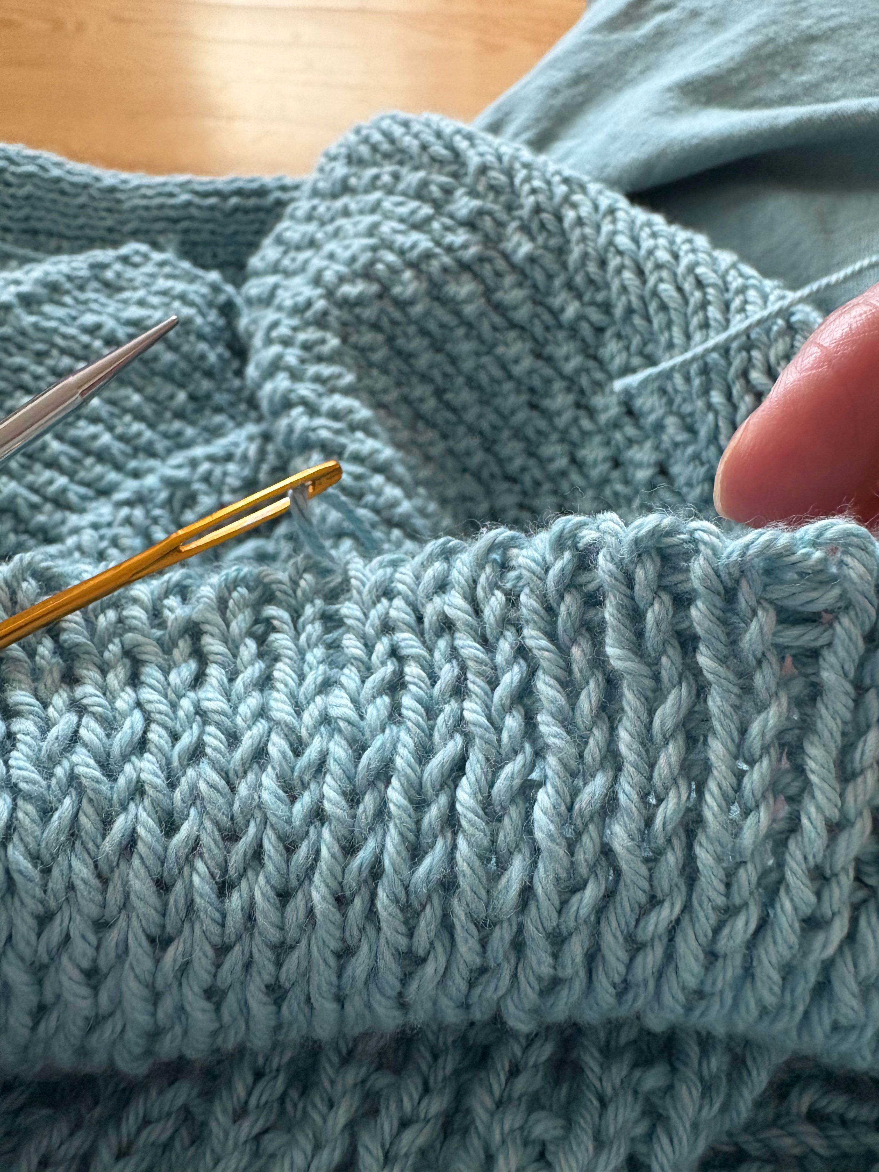 Today I took a few minutes between folding loads of laundry from the wonderful visit with my brother and sister-in-love, my nephew and his family, to do a tubular bind off on my Big Love Cardigan. I don’t remember doing a tubular bind off before but it’s really slick! I love the way it looks, it’s stretchy but not stretched out and It’s a really nice bind off … this one was a lot of sewing but it’s now off the needles. On to sleeve island when I finish the blanket.