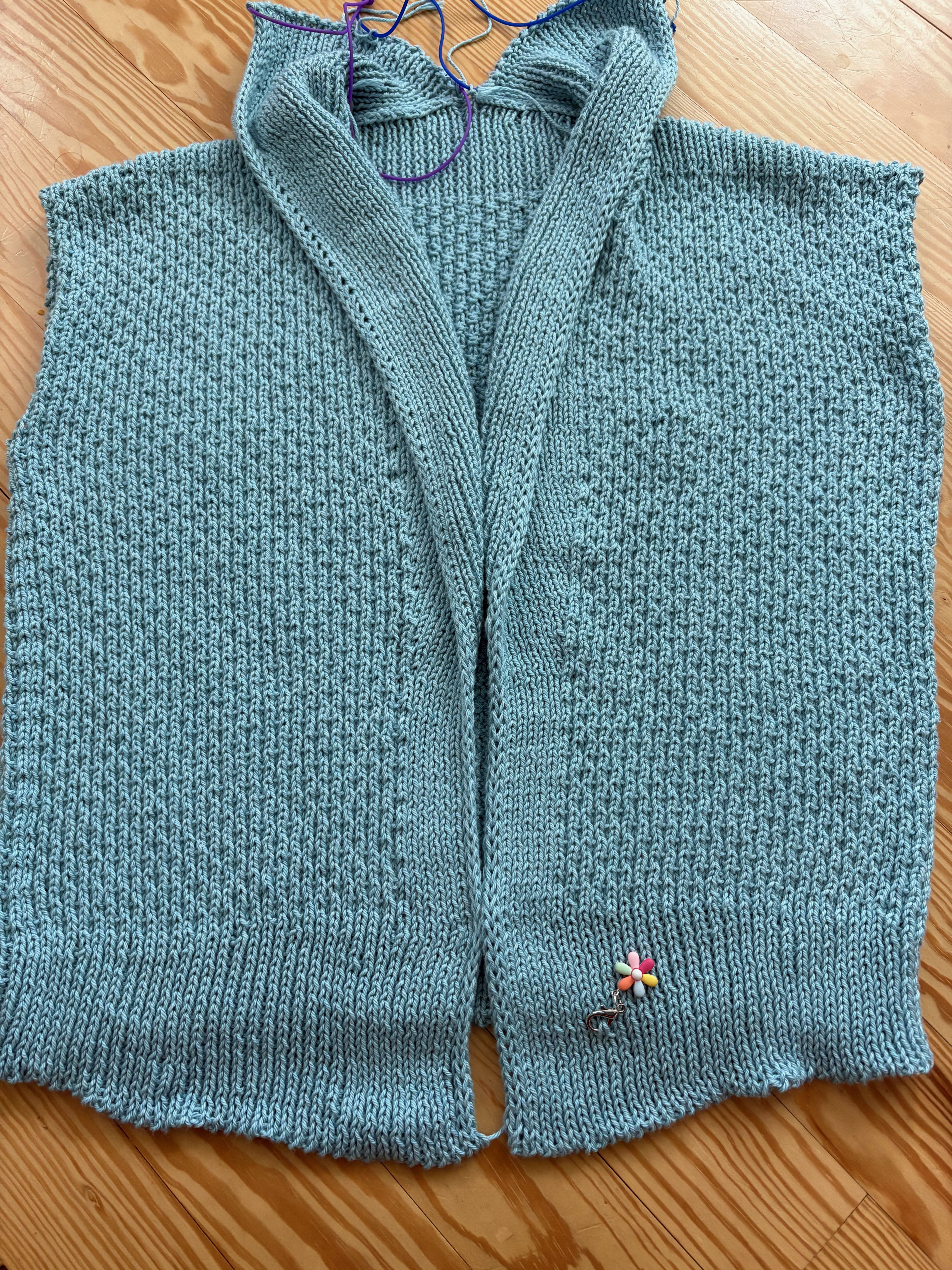 What I am really loving about this cardigan and what surprised me about it when I started knitting it is the texture. I had thought it was just stockinette stitch. Ha! I was wrong. It’s a simple enough four-row repeat with a 1×1 ribbed button band that is knitted on from the collar down. I am assuming that somewhere in the pattern, they’re going to have me stitch together the two pieces of the collar where the whole sweater started. But it’s a really pretty sort-of-ribbing texture that is easy enough to remember. I’m readjusting my memorized stitch pattern now, though, since all the pieces are now combined with a false seam between them. I have a feeling that I will make another one of these one day in wool … and maybe a size larger so it’s really cozy to wrap up in. This one, I hope, will be a bit more tailored for summer.