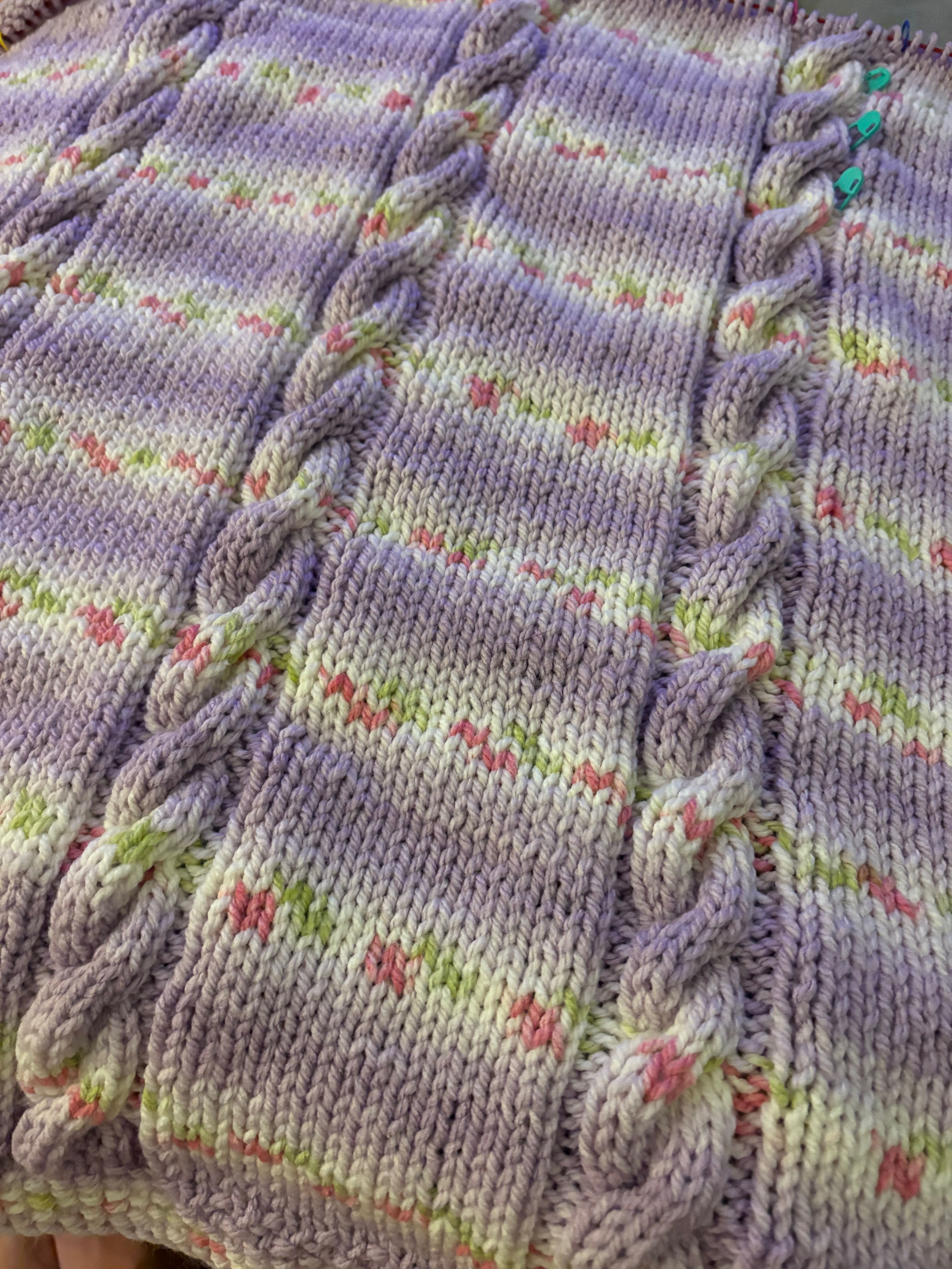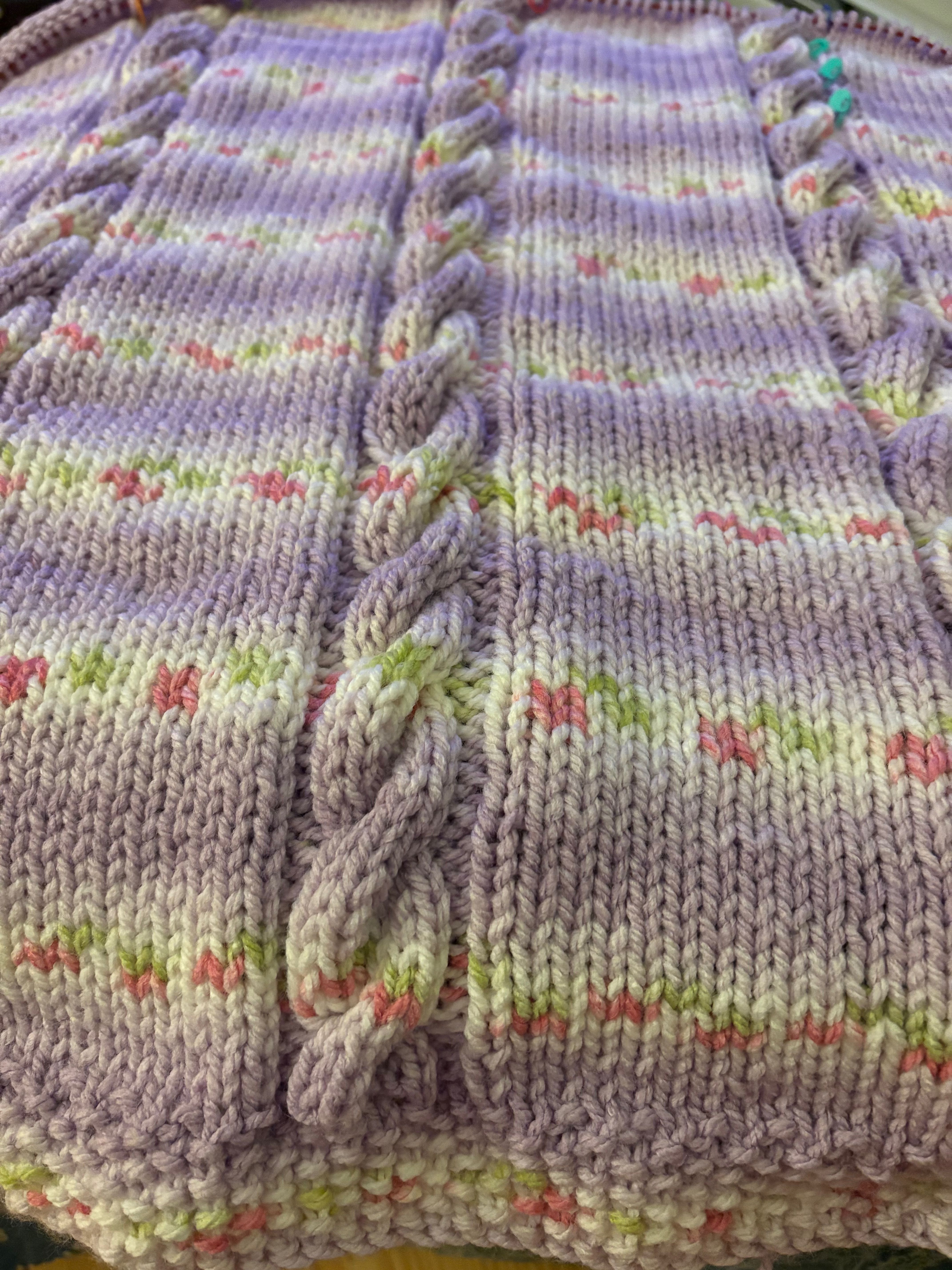 I decided to try to cast on and knit the little blanket for my granddaughter’s bed. It’s a pattern from the LYS where I work called the “Three Cable Baby Blanket” and it’s made with Hayfield’s Baby Blossom Chunky yarn and US 10 1/2 needles so it’s a quick knit and I’ve been pushing it. I have made it to the 14th cable twist and that means that I have three more plus the edging to go. I should make it by the deadline of bedtime tomorrow night. I love this yarn – machine wash and dry – and it’s soft and snuggly. Sylvie has one in pink at home that was a gift and she loves it. I thought a few things that were like those she has at home would make our house feel more like home, too. Tomorrow night will be the test.