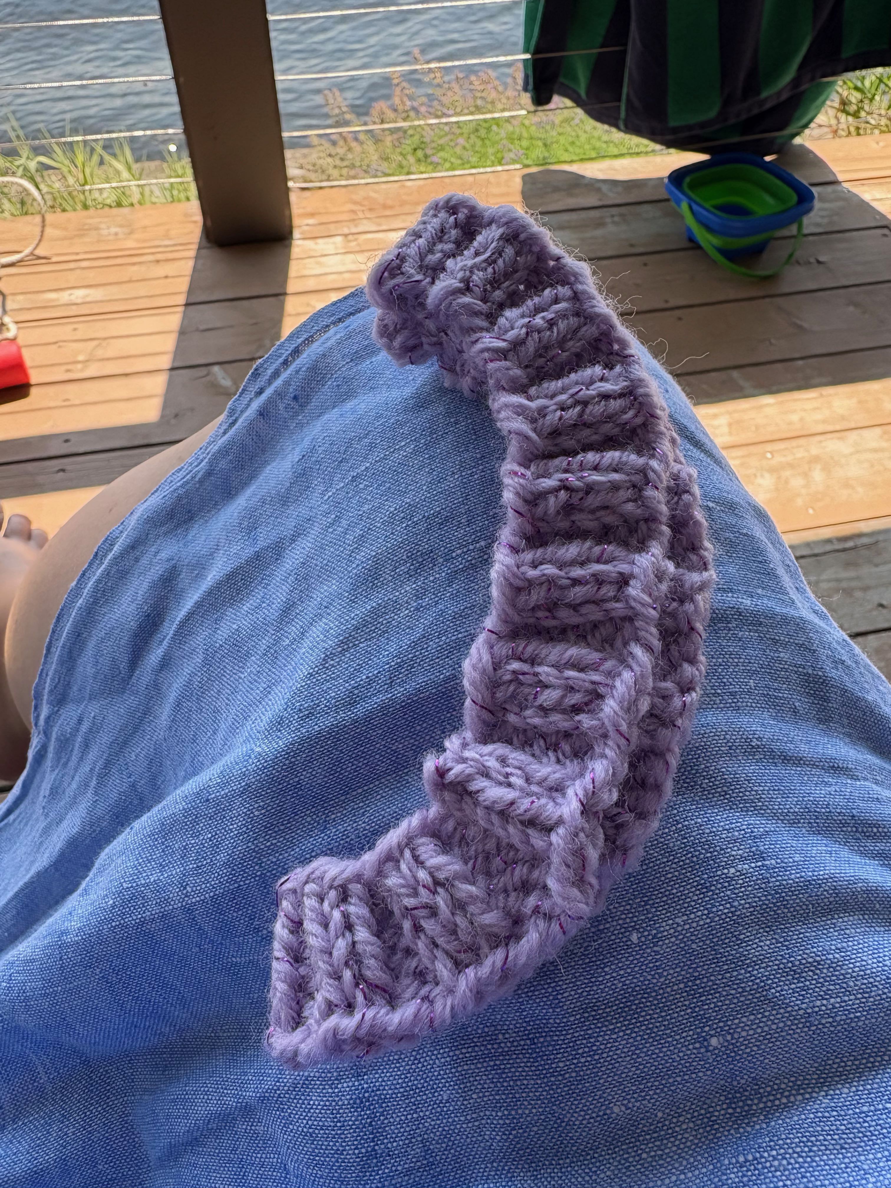 I took Sylvie on an adventure – to drop off her aunt at the rental car place and then took her to work to meet the women I teach on Friday morning and to pick out some yarn for “mermaid headbands”. I’d made her a mermaid tail when she was a baby with a headband to match (and a shell bikini top). It had become too tight for her toddler-sized noggin. She picked her favorite color – purple – and I whipped up a couple headbands in an afternoon. I can’t resist when she asks me for something.